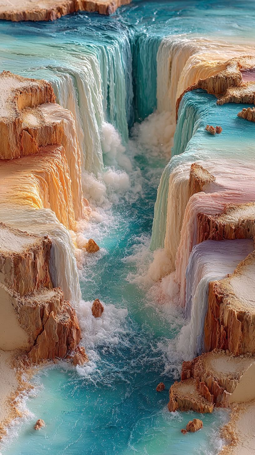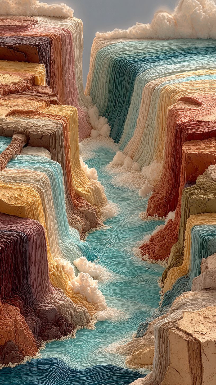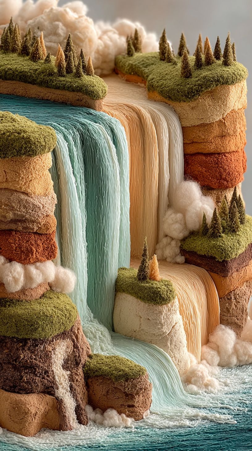 Niagara Falls,Real water is flowing.,A claymation-style, sculpted with rough fingerprints, hand-painted imperfections, and smudges. Set in a diorama of earthy textures and pastel backdrops, giving it a tangible, handmade feel. --ar 9:16 --stylize 1000