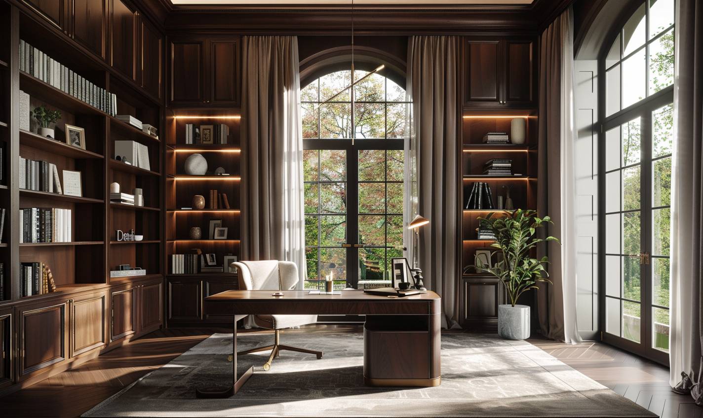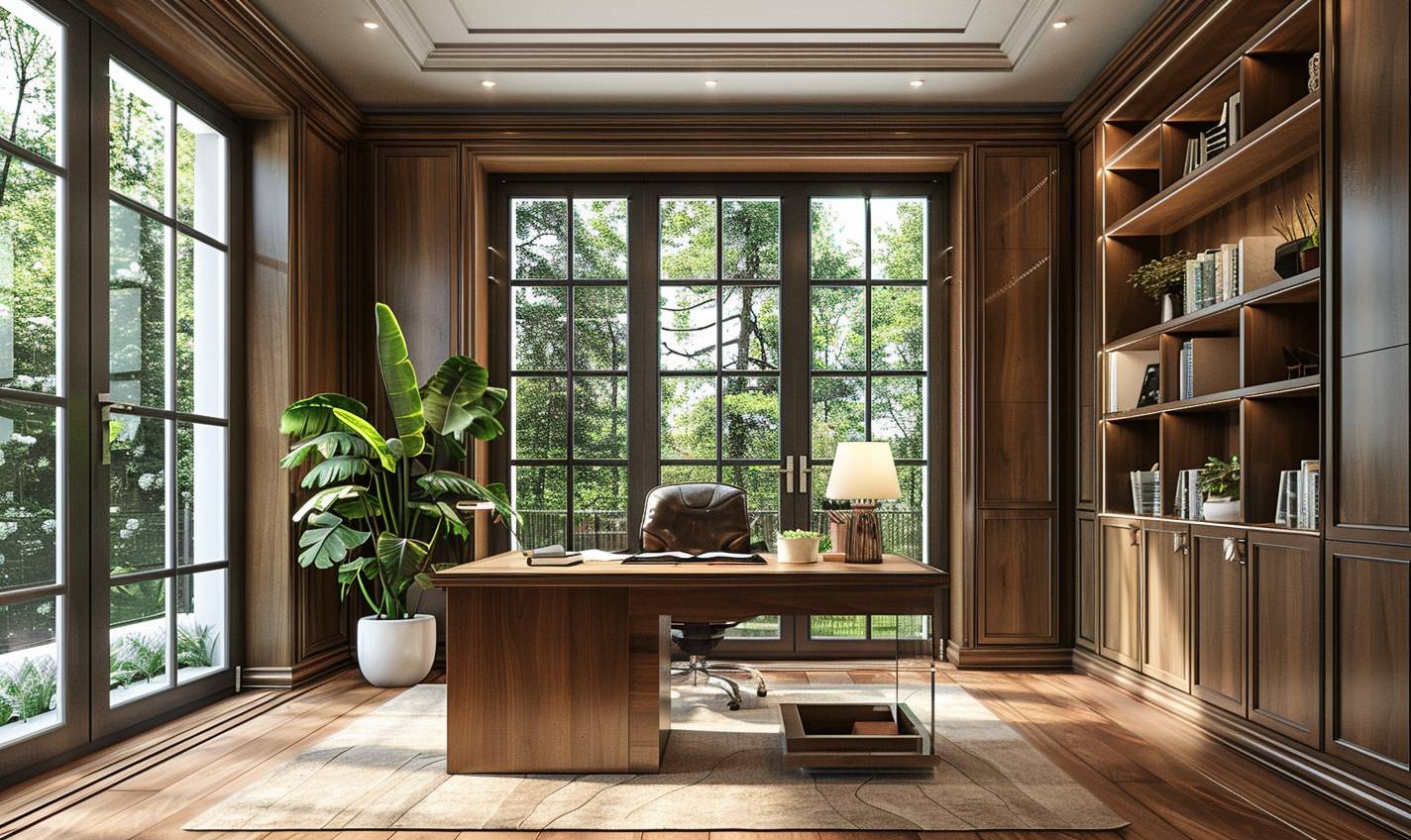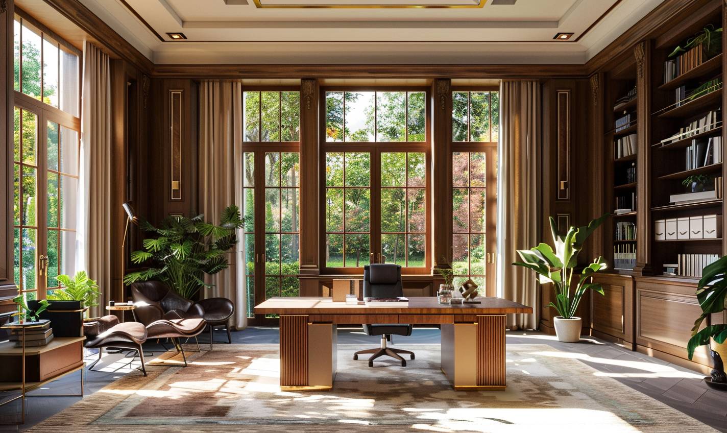 A study room featuring mahogany walls and a large walnut desk, large windows with natural light, light colors, plants, modern furniture, showcasing classical interior design.