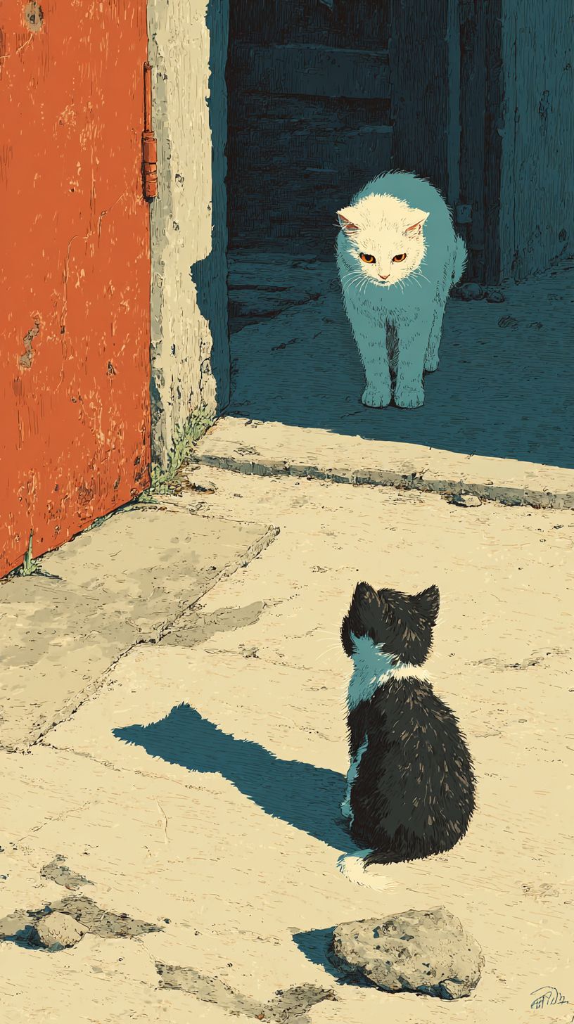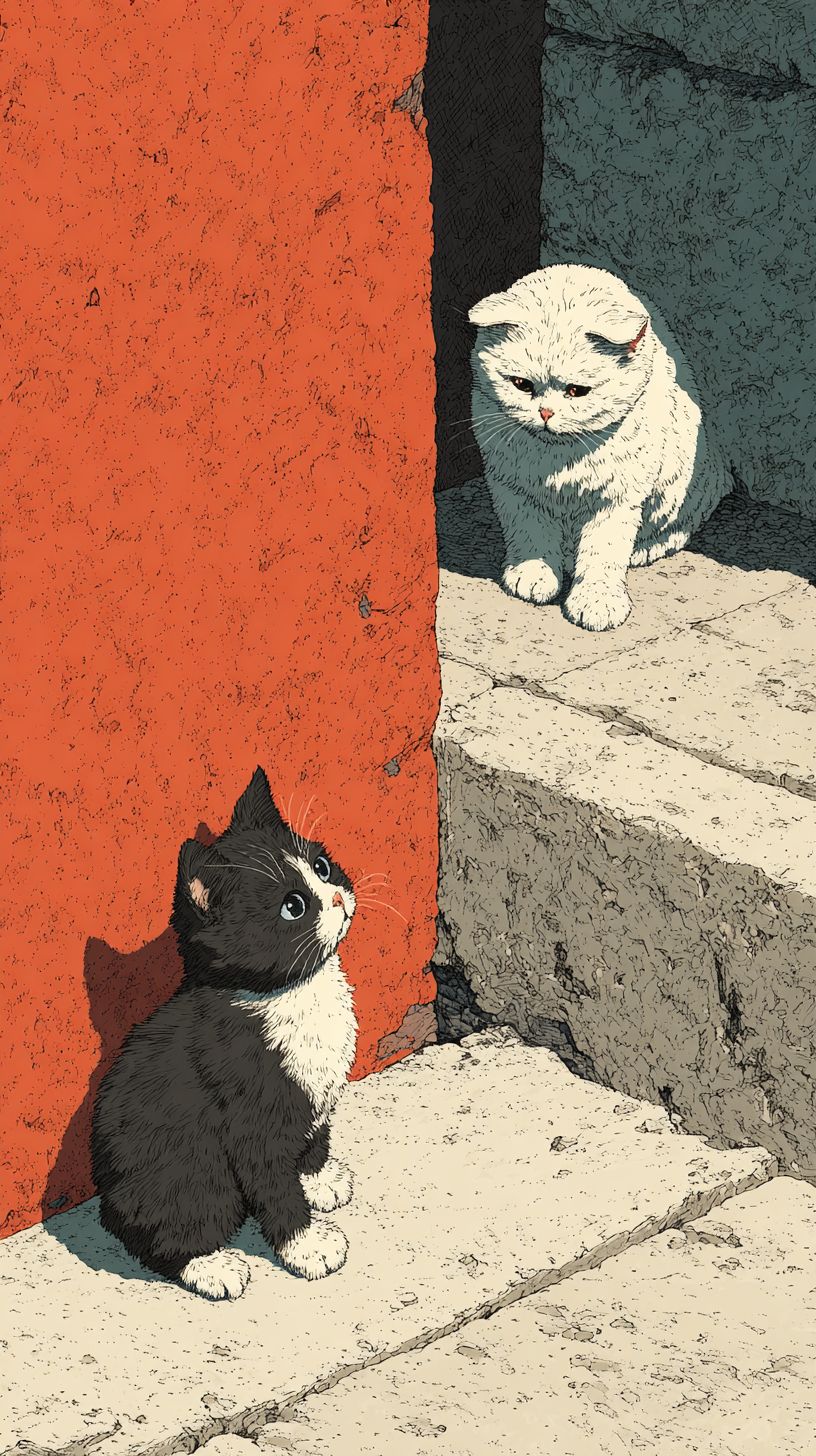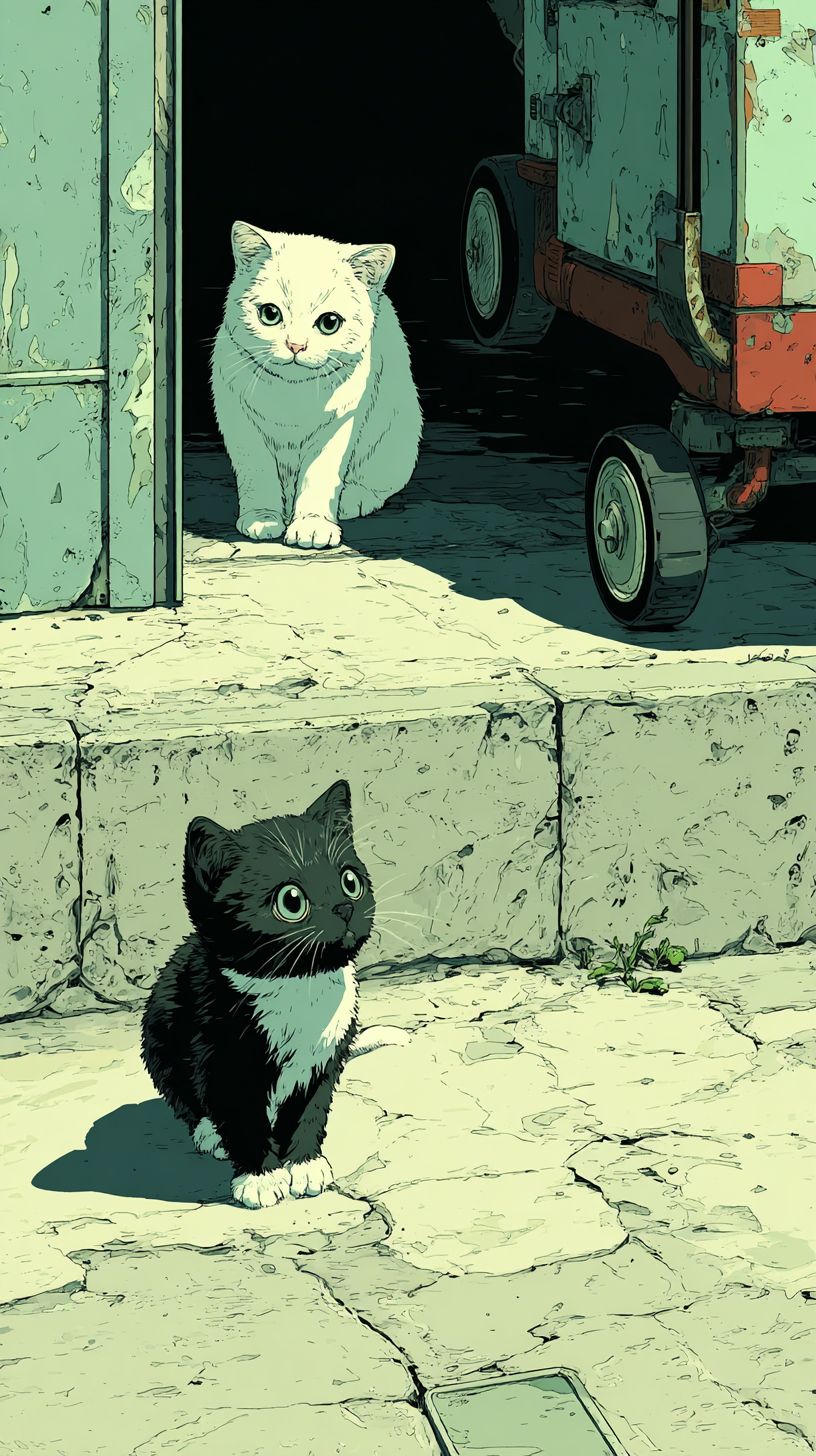 An illustration, Tatsuro Kiuchi, shows a white cat mother in the distance, glaring fiercely at the black and white kitten in front of her. The foreground of the scene features a kitten with drooping ears, its eyes filled with sadness and reluctance, as it turns to look at its mother cat. The scene is set in an open cement basement with a cement floor as the background ground. --ar 9:16 --s 750