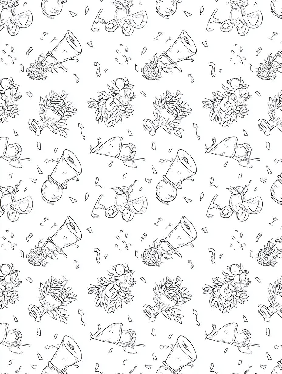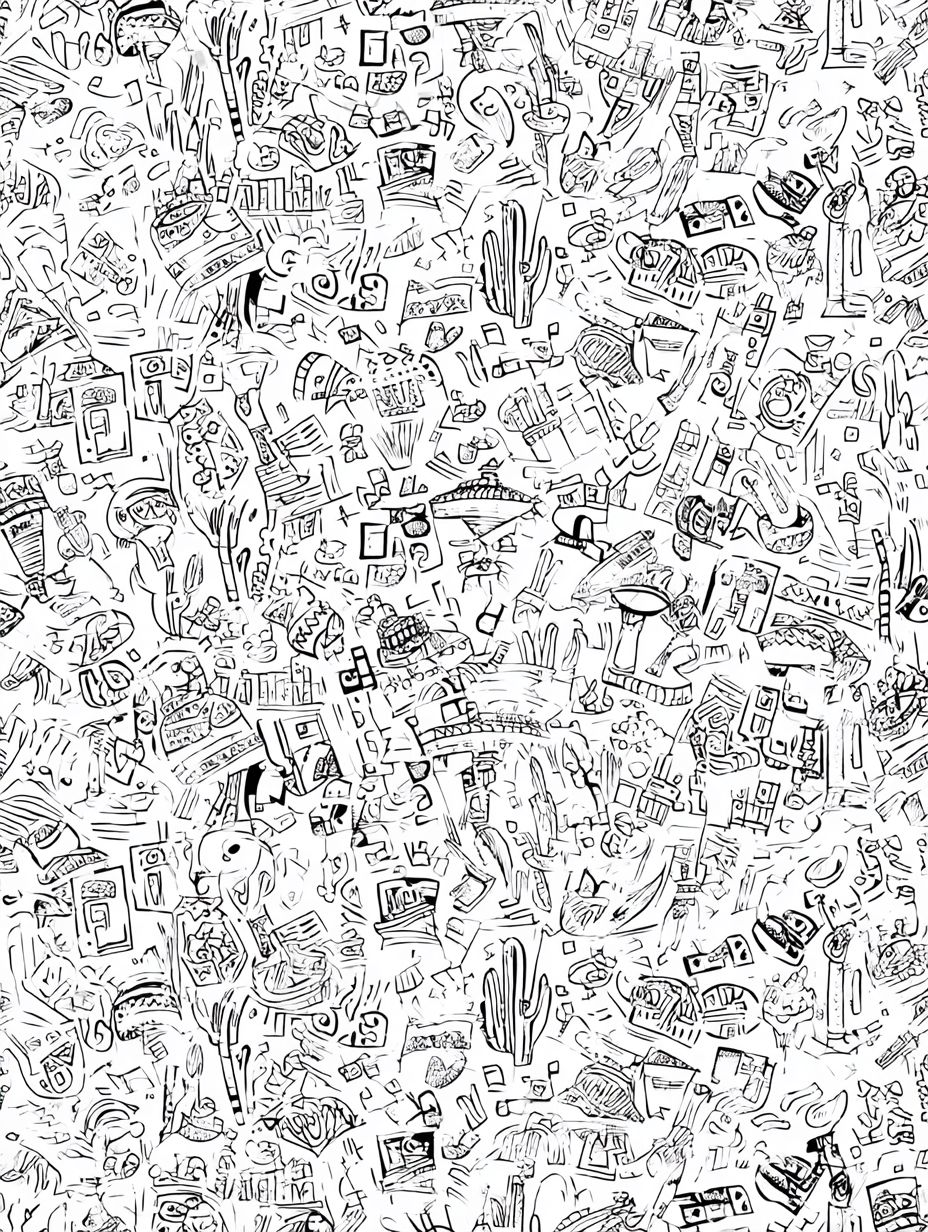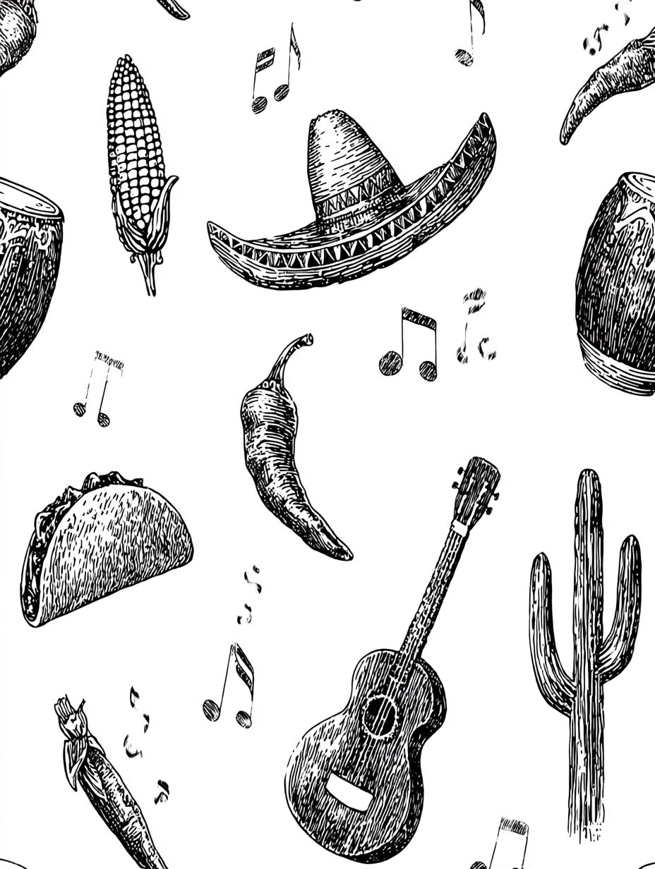 americana a seamless pattern of hand-drawn Mexican heritage icons, tequila, including cacti,, speakers, maracas, sombreros, tacos, chilies, flowers, and corn, music notes, confetti, all in a black monochrome vintage engraving style, fine line art, minimal detail, white background, stamp texture, vector style, speakers on the top half --chaos 45 --ar 3:4 --stylize 0