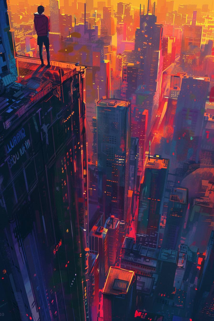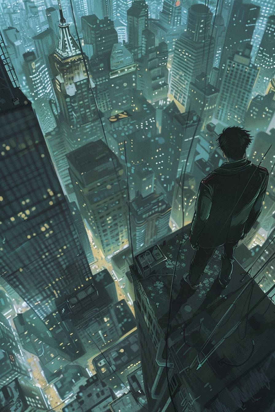 An illustration of a man overlooking the city from a high building.