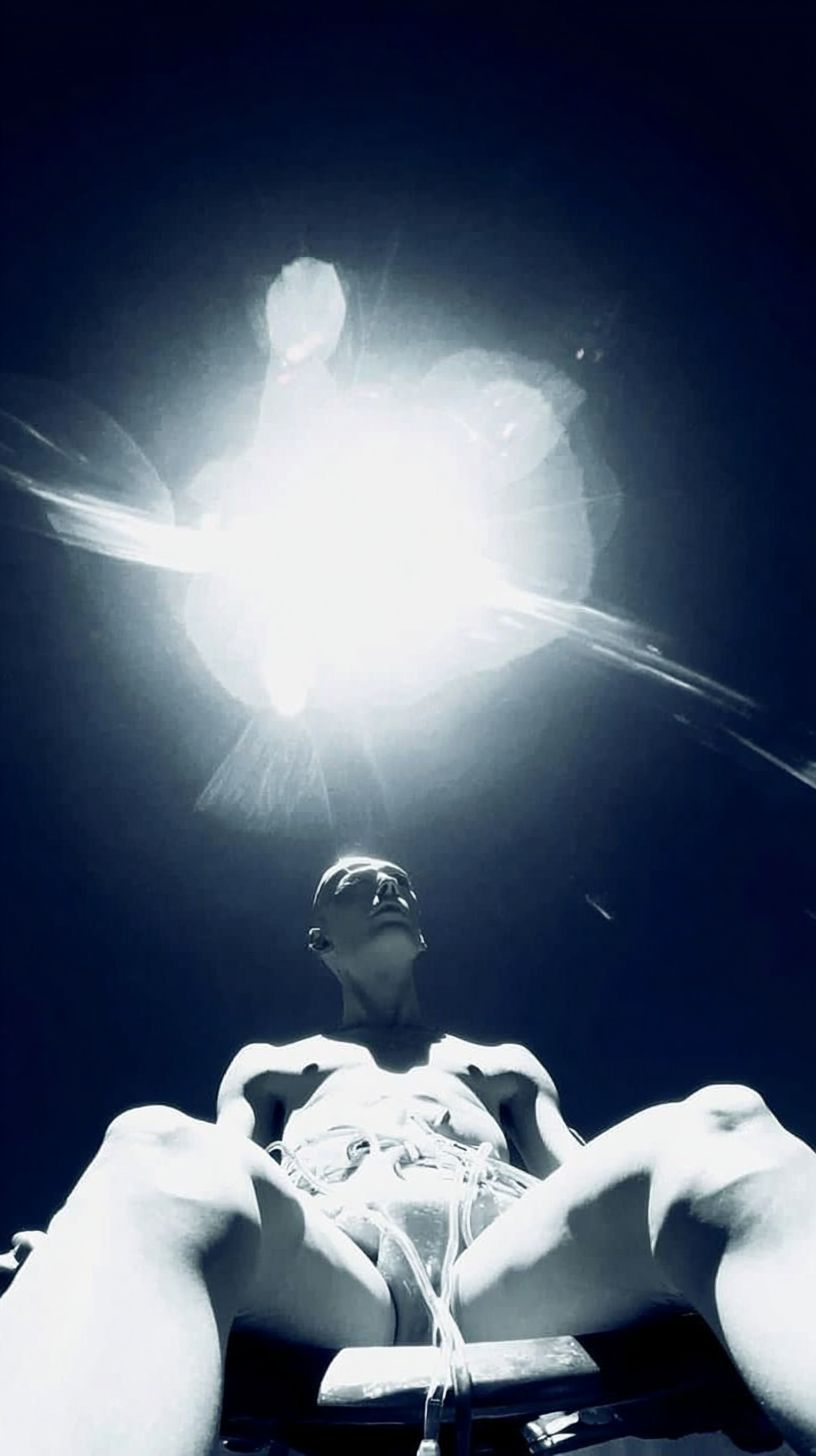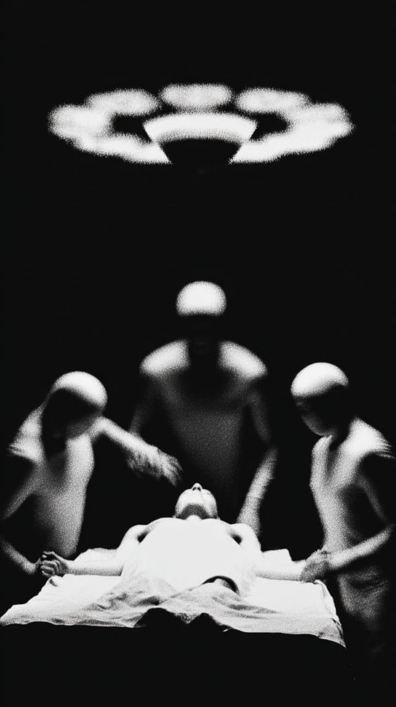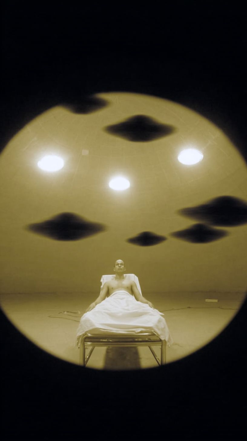 athletic male strapped onto a hospital bed on an alien spaceship laboratory, being studied by dark mysterious shadow-like aliens, fisheye lens, roof taking up top half of frame, oddly peaceful and visually satisfying --ar 9:16 --profile xze4knu --stylize 600