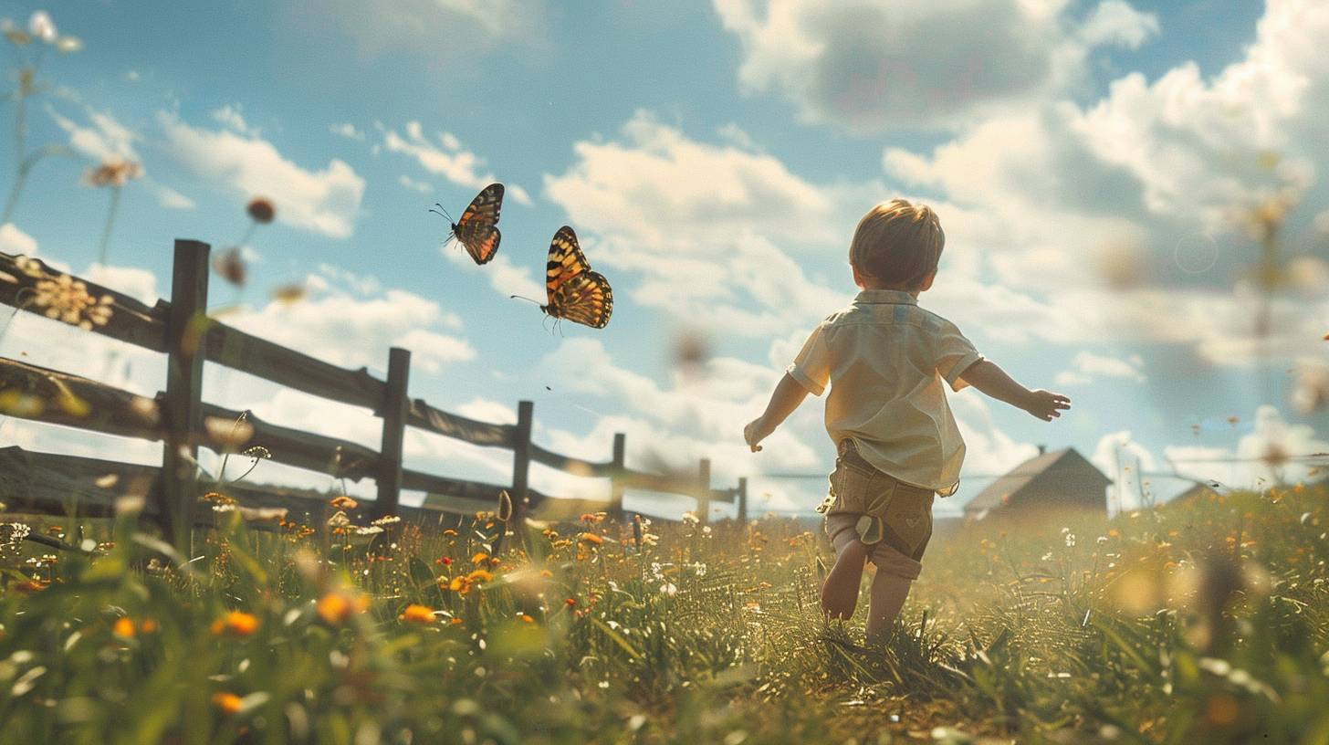 A child chases a butterfly in a field, laughter in the air, with grass stains on his knees in a rural landscape.