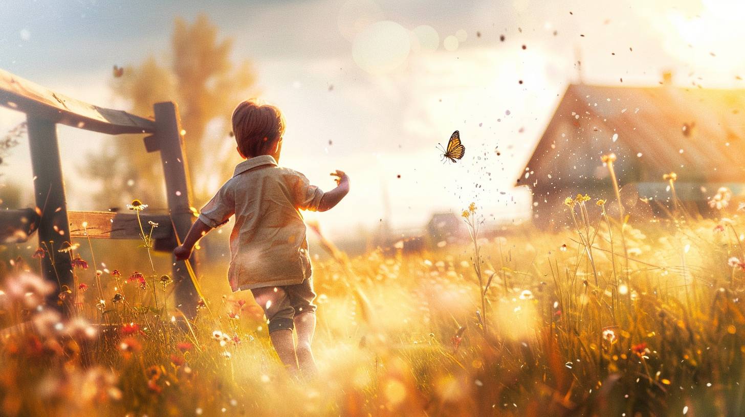 Child in a field, chasing a butterfly. Laughter caught mid-air. Grass stains on his knees. Rural landscape. Midday. Wildflowers, a wooden fence, a farmhouse in the distance. Wide shot, full body. Bright sunlight, butterfly frozen mid-flight, dust particles floating in the air. Hyperrealistic capture. --ar 16:9 --v 6.0