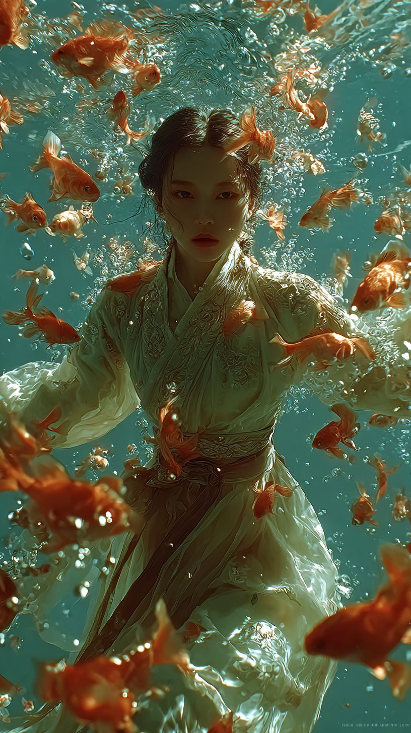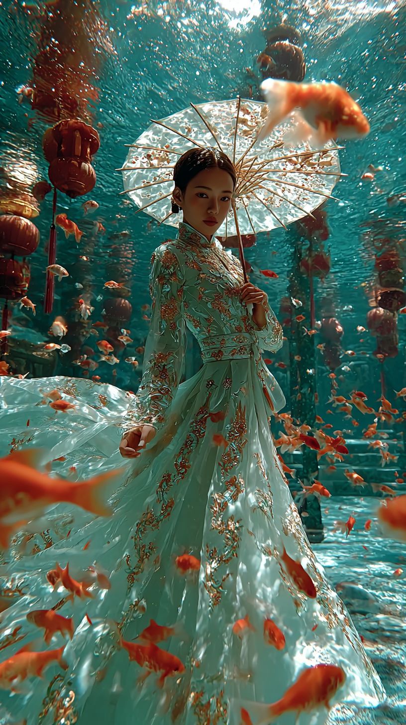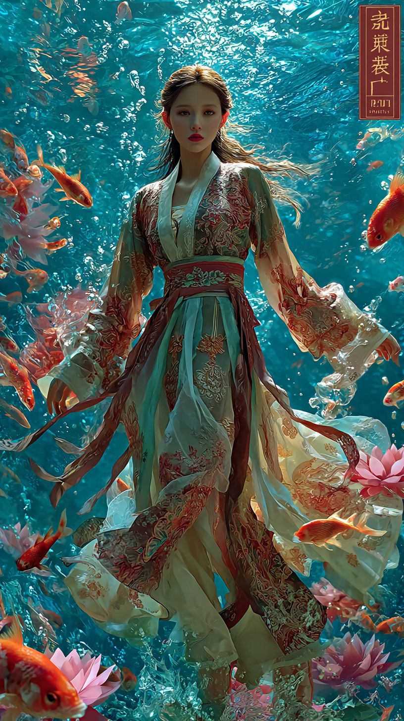 a beautiful young Chinese girl in ancient flowing hanfu, selfie angle, looking at camera, elegantly walking underwater in a grand mythical Chinese ancient palace. her porcelain-pale face glows with a crystal-clear translucency, with exquisitely delicate features and bright, expressive eyes full of soul and mystery. her long silk hair and wide sleeves drift softly around her as she poses with gentle grace. towering jade columns, massive dragon carvings, and flowing banners fill the vast underwater palace around her. glowing lanterns cast dreamlike ripples of light through the blue. lotus petals and koi fish swirl past in slow motion. she gazes directly at the "camera" with serene elegance and a playful smile. cinematic lighting, ethereal under, ultra detailed, high realism, photorealistic, 8k --ar 9:16 --raw --stylize 1000