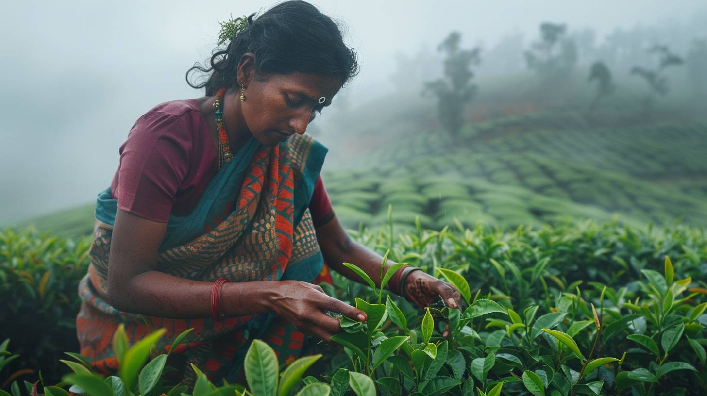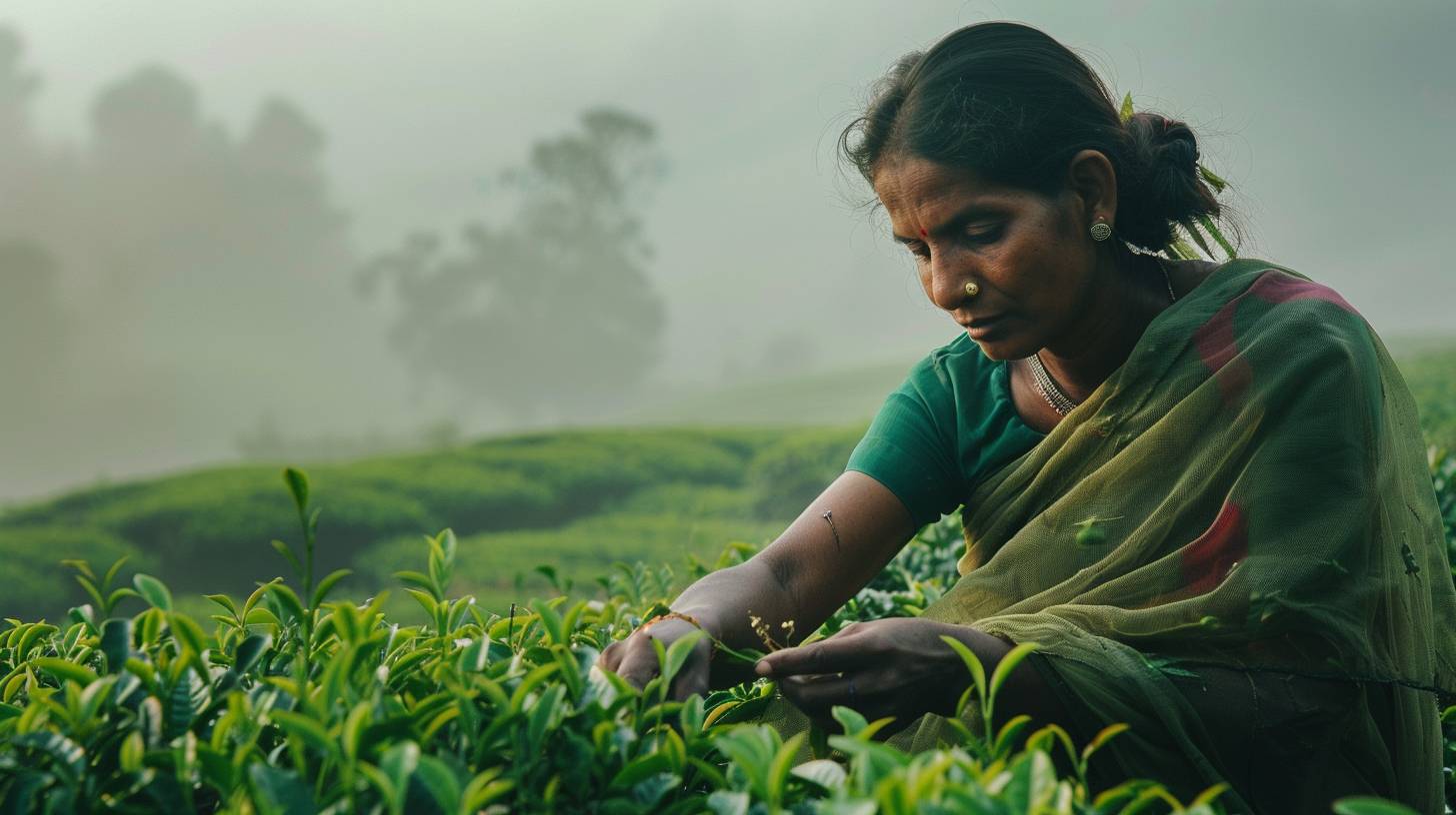 A woman in a sari is picking tea leaves in an Indian tea plantation, gracefully working in the misty hills of the morning.