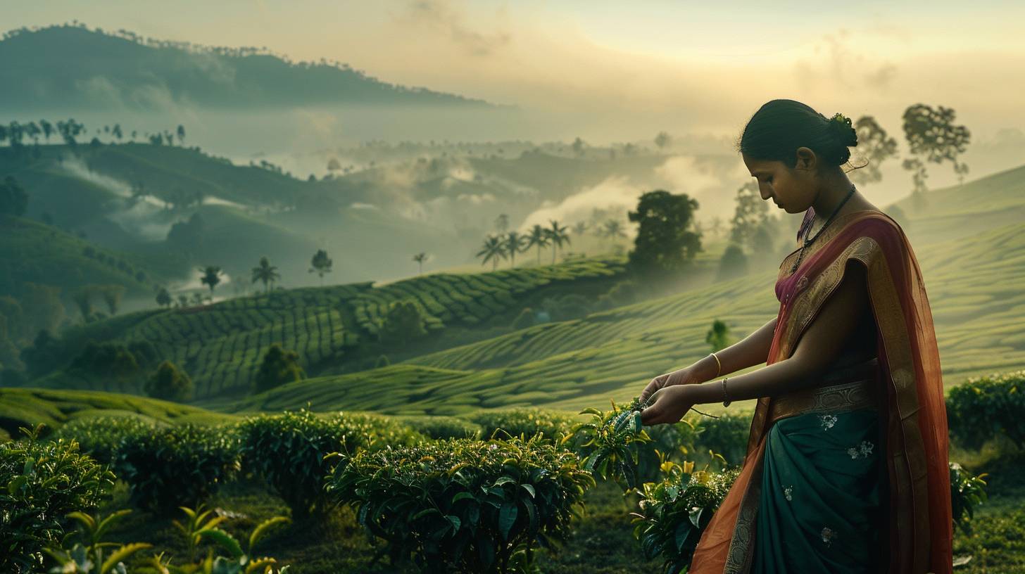 A woman in a sari, picking tea leaves. Dark eyes. Graceful hands. Indian tea plantation. Morning. Misty hills, rows of tea bushes. Wide shot, full body. Diffused lighting, mist softening the landscape. Vibrant color palette.