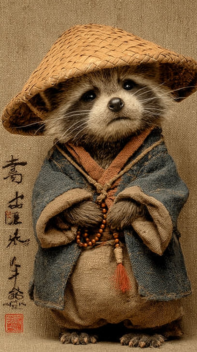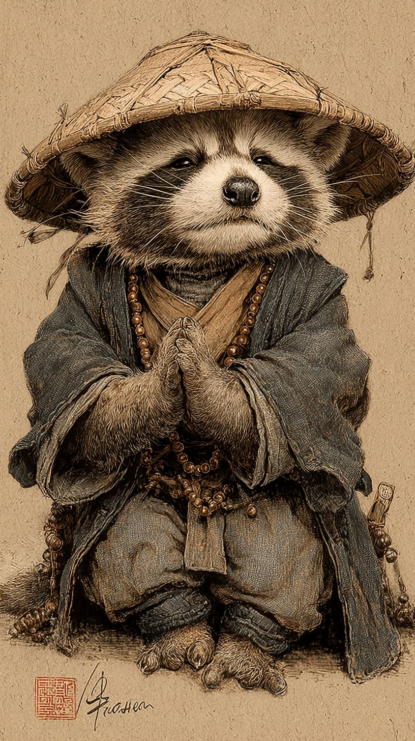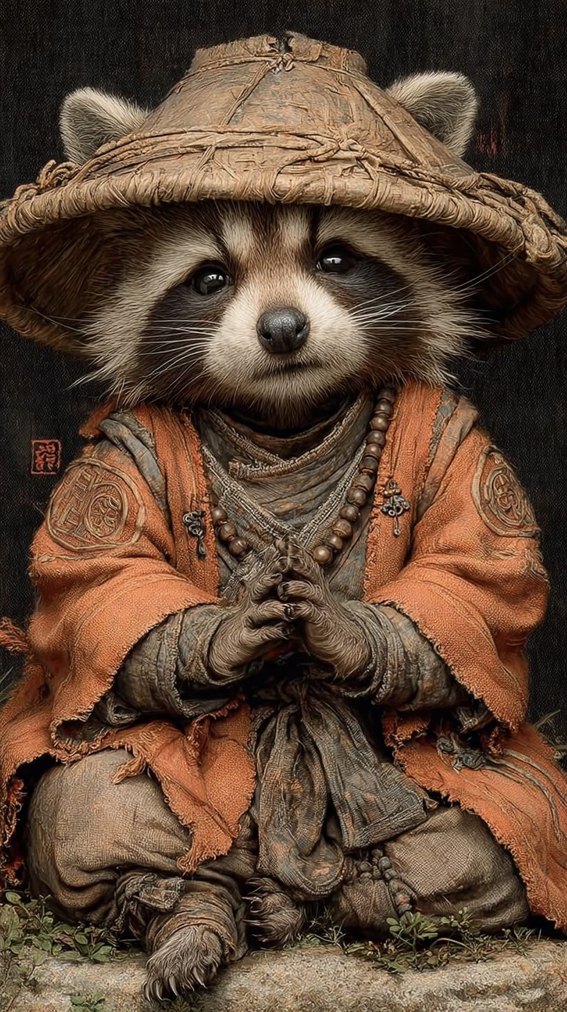 Fine brushwork, little raccoon, front view, wearing a bamboo hat, full body close-up, sitting cross-legged, wearing monk's clothes, wearing a string of Buddhist beads, with hands folded, cute, ancient Chinese style, --ar 9:16 --s 750