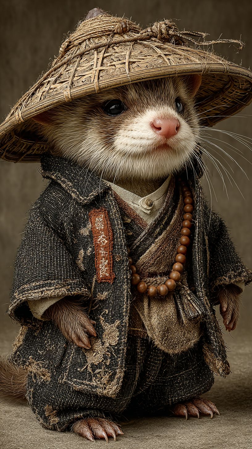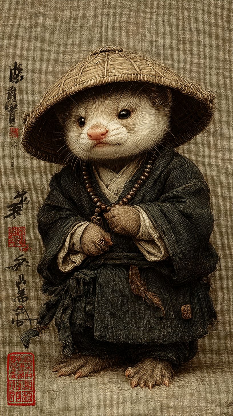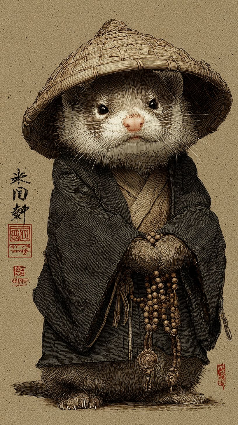A cute ancient-style little ferret sitting in monk's clothes with a bamboo hat and holding Buddhist beads
