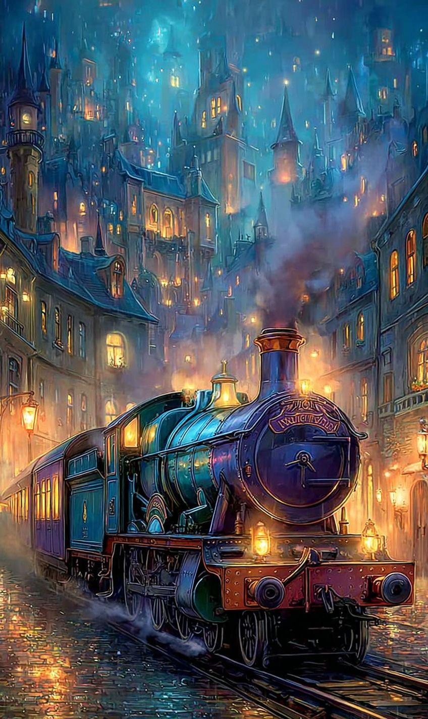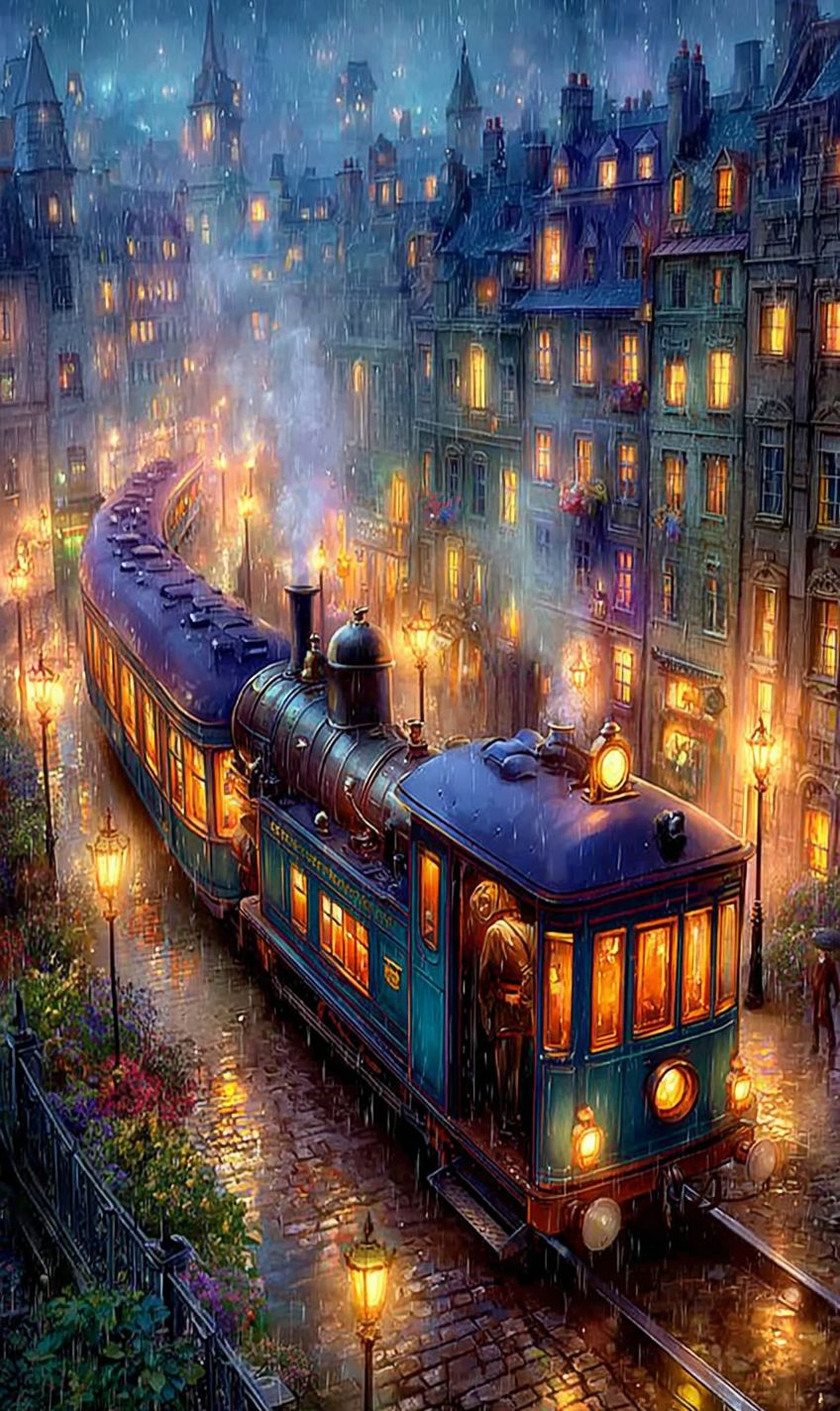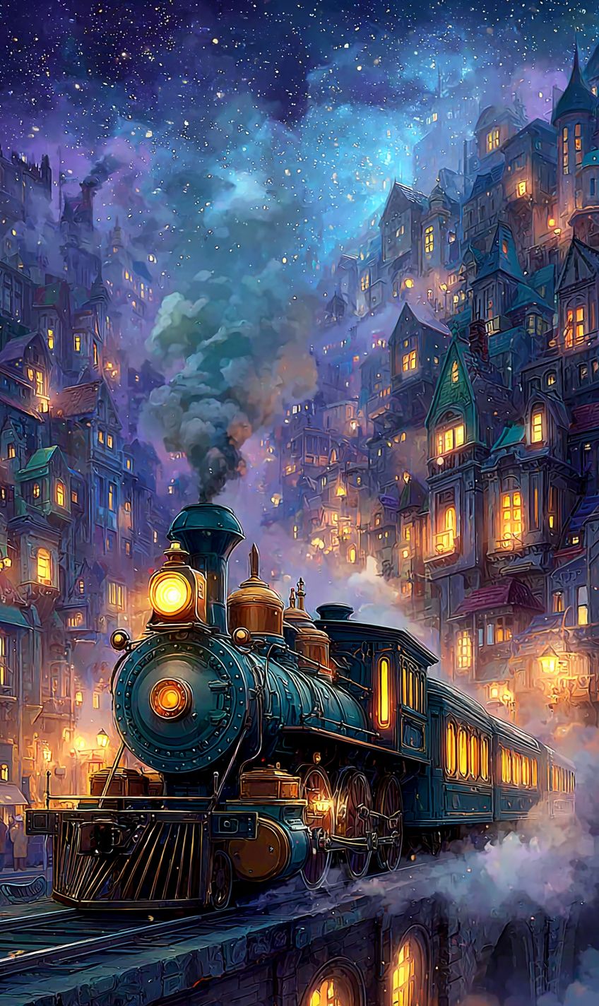 A steampunk train speeding through a foggy industrial city, brass and leather accents, glowing lanterns, cinematic composition, hyper-detailed, Victorian aesthetic --ar 3:5 --sref 1567159629 --v 7.0 --s 750