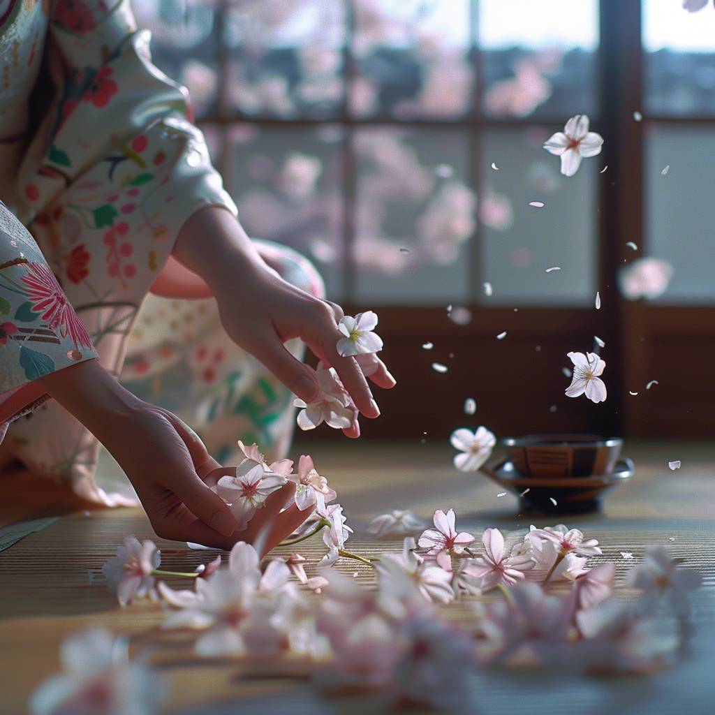 Woman in a kimono, arranging flowers. Delicate hands. Cherry blossoms. Traditional Japanese room. Morning. Tatami mats, sliding doors, a tea set nearby. Close-up shot, hands and flowers. Soft light filtering through rice paper doors, petals falling in slow motion. Photorealistic details. --ar 1:1 --v 6.0