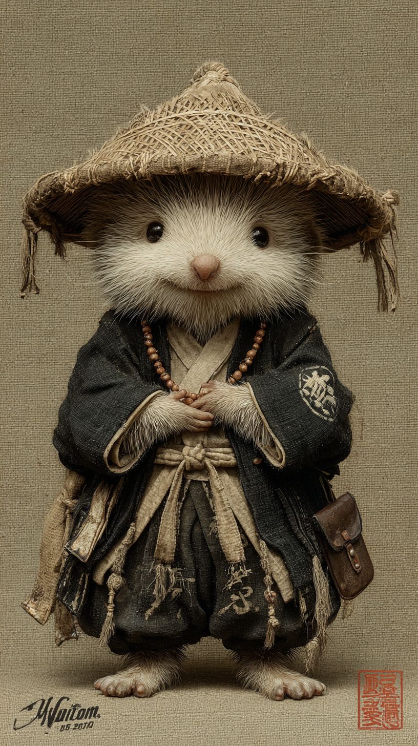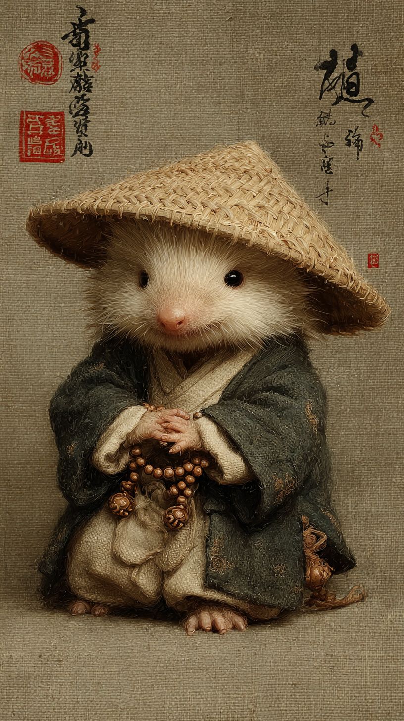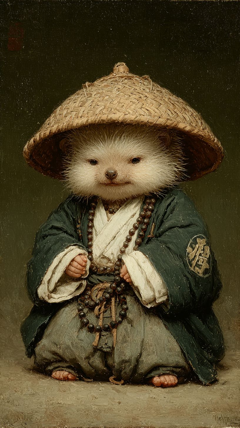 A little porcupine in monk's clothes and a bamboo hat is sitting cross-legged with Buddhist beads in its hands, showcasing an adorable ancient style