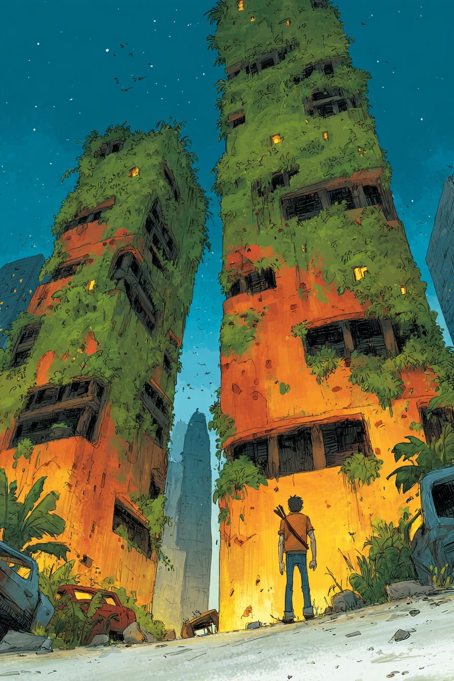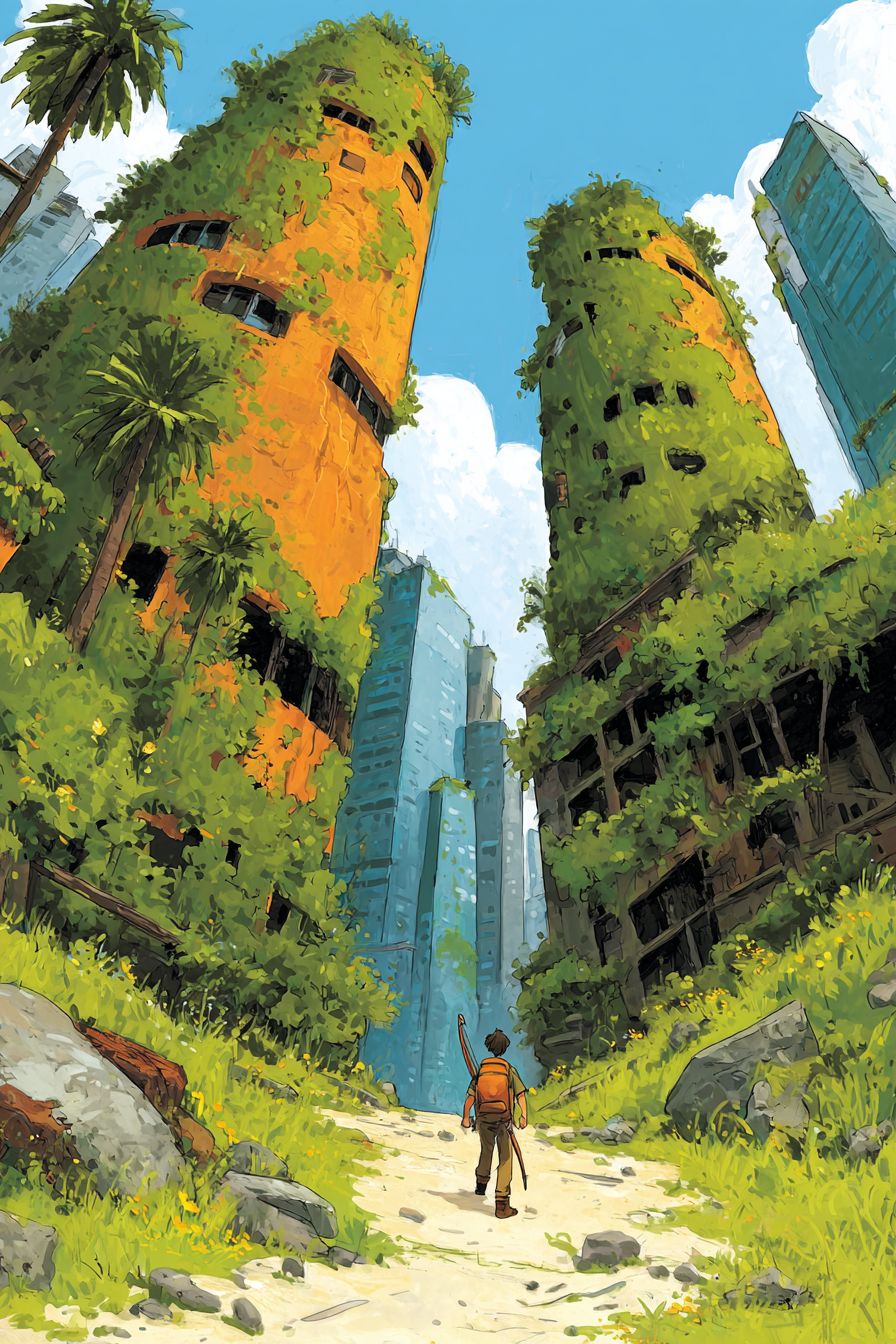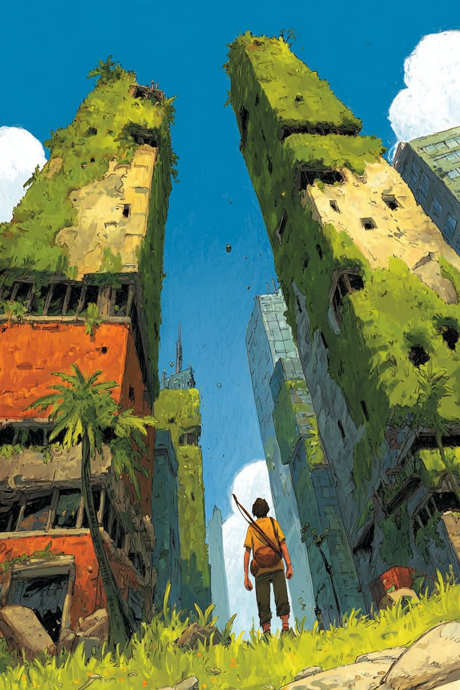 A post-apocalyptic city overtaken by lush greenery, crumbling skyscrapers with vines, lone survivor with a bow, cinematic lighting, hyper-realistic, moody atmosphere --ar 2:3 --sref 680572301 --v 7.0 --s 750