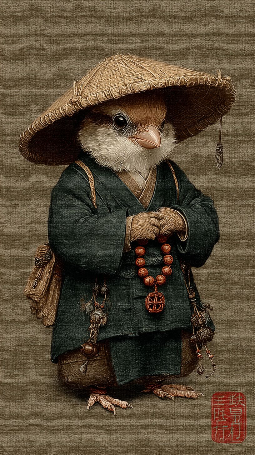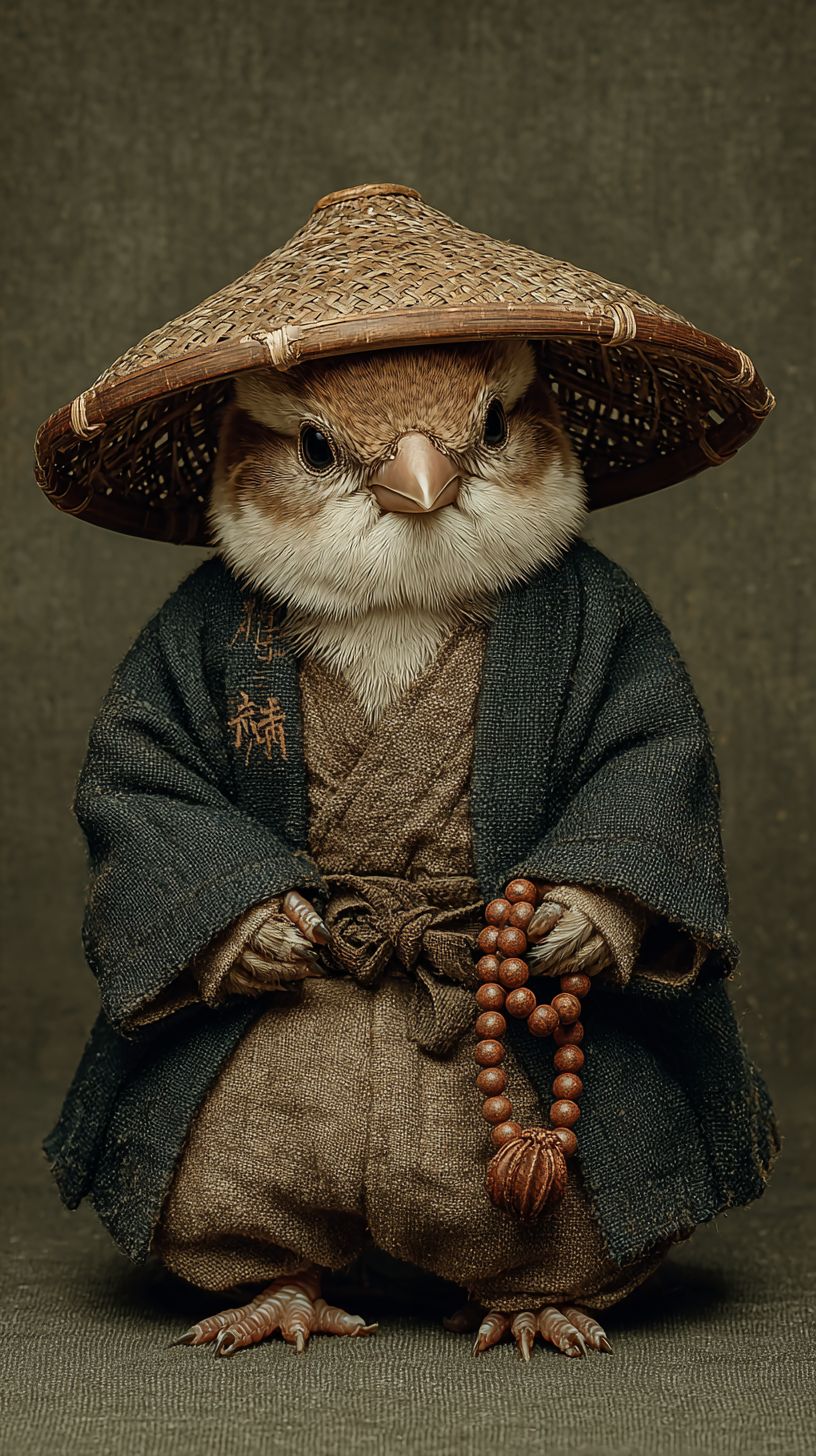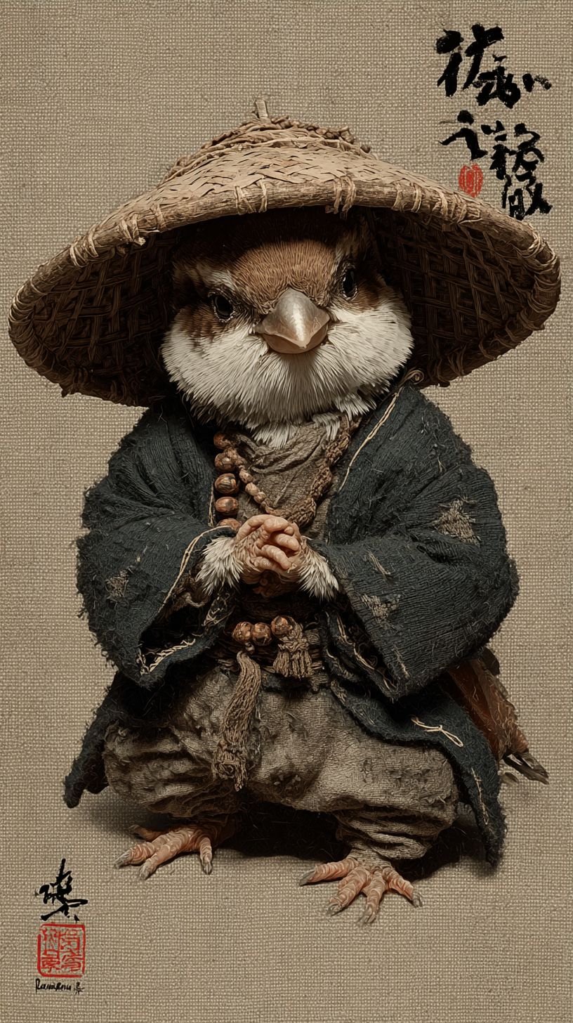 A little sparrow in monk's clothes with a bamboo hat sitting cross-legged