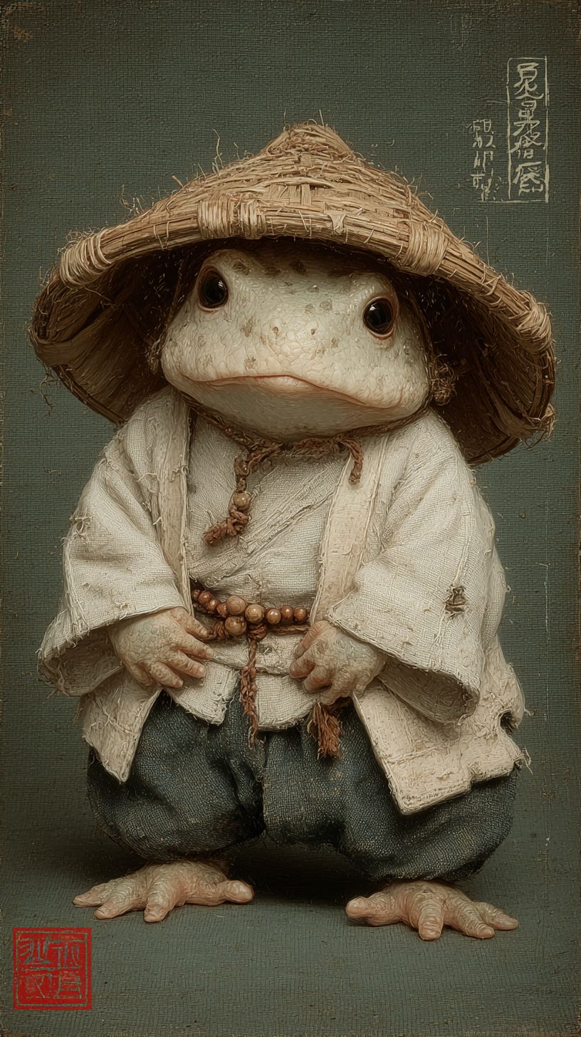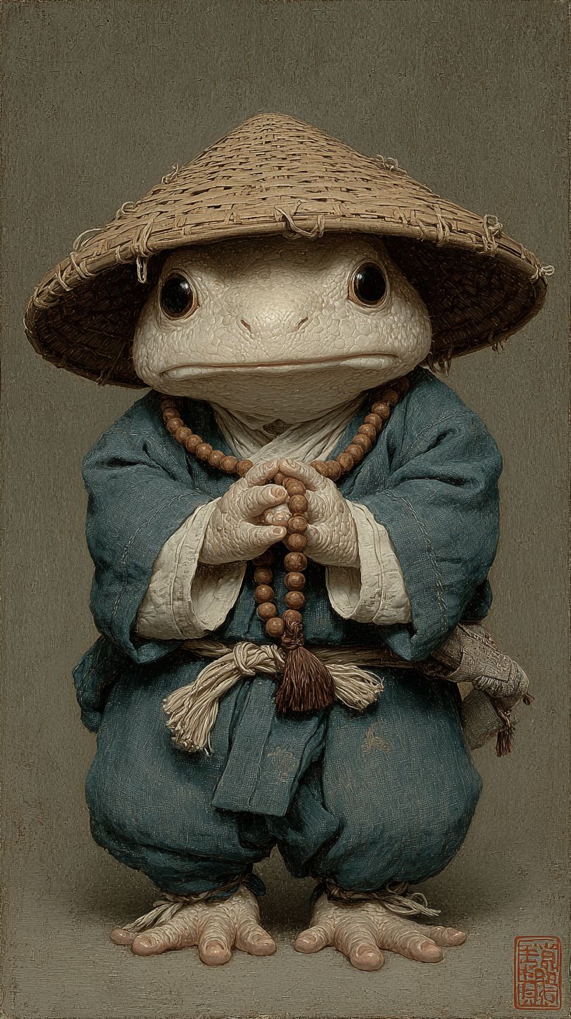 A cute little frog in monk's clothes and a bamboo hat sitting cross-legged with hands folded
