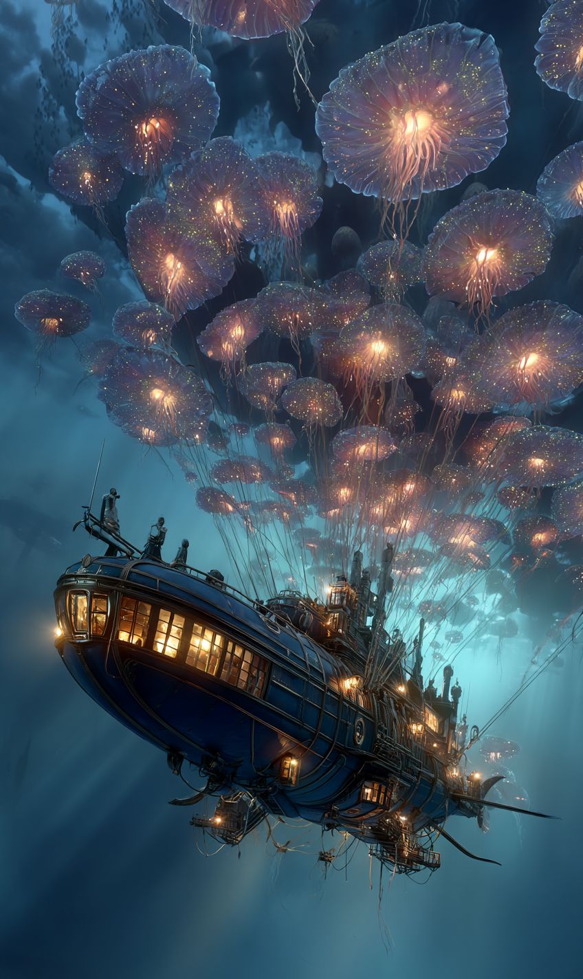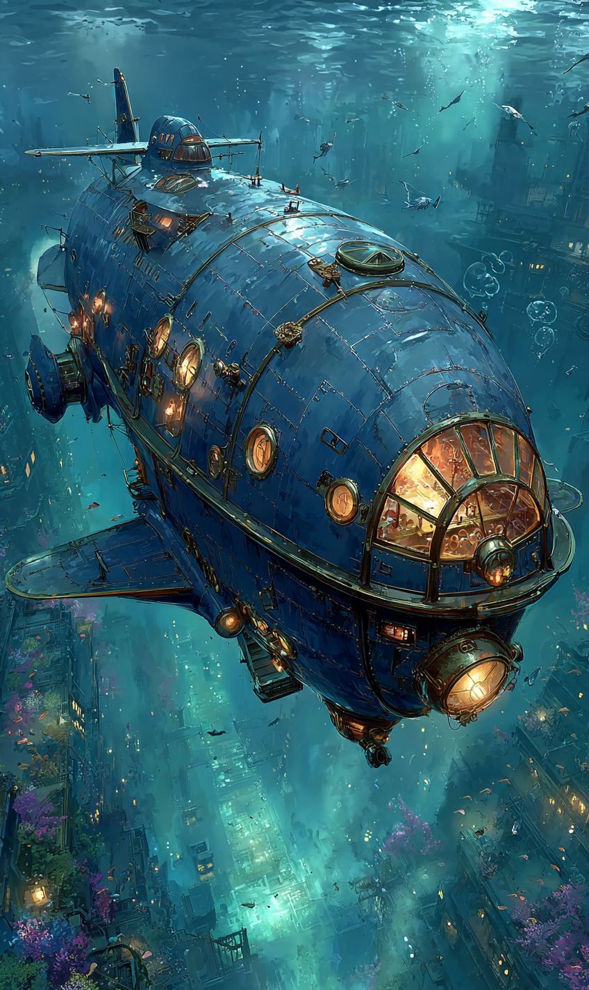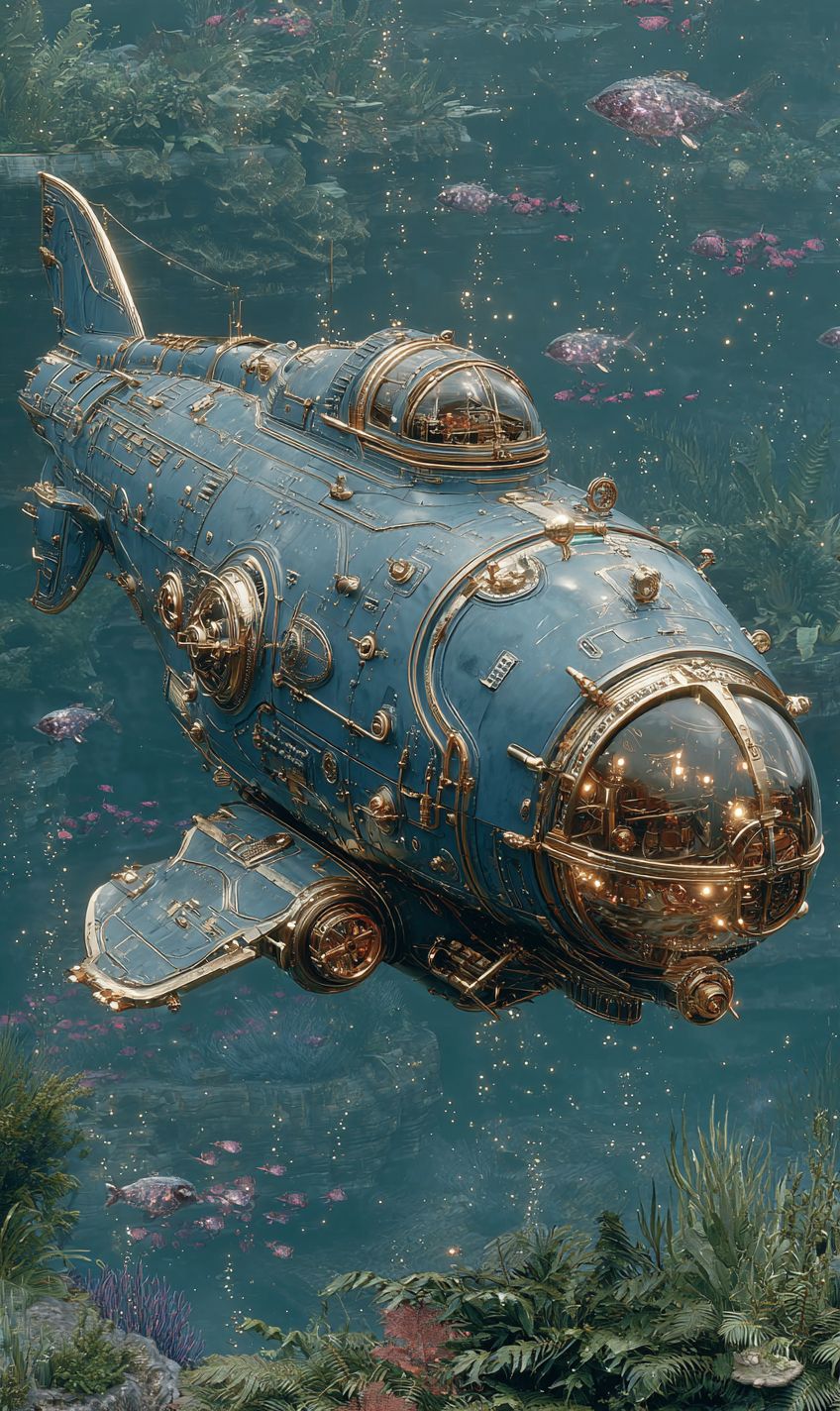 A steampunk submarine exploring a bioluminescent ocean trench, glowing sea creatures, intricate brass and glass design, cinematic lighting, hyper-detailed, adventurous vibe --ar 3:5 --v 7.0 --s 750