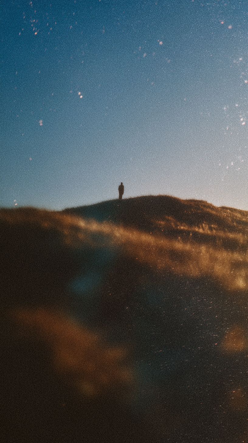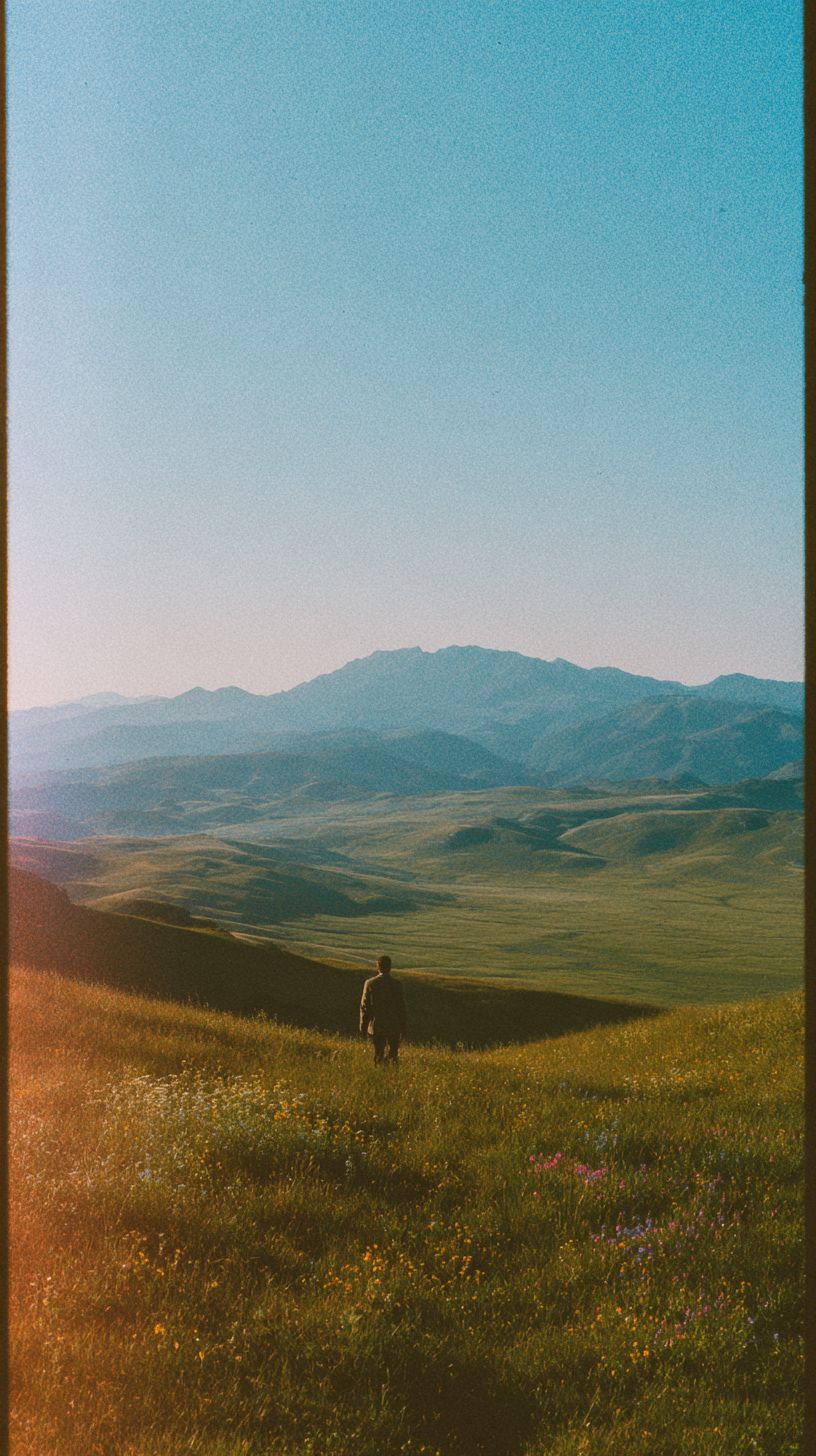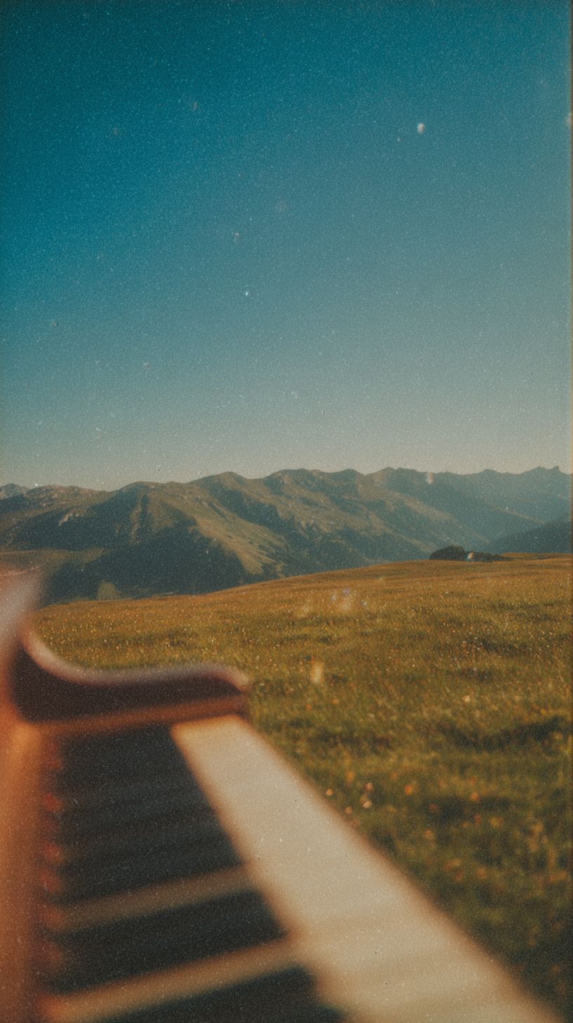 ultra high resolution photo, in the style of instant film, Fujifilm Pro 400H film, black negative film, add noise, grain, ratcore, contax tix, back of a man climbing a hill with a green field and playing the piano from afar. Raw High Resolution, ultradetailed, natural lighting, Fujifilm GFX100s absolutely huge, studio lighting, by martin parr, looking at the lights and decorations, with a warm, cozy atmosphere. High-resolution photography, detailed, professional color grading, soft shadows, low contrast, clean, sharp focus, cinematic photography in the style of Fujifilm Superia, taken on a Canon EOS R5 at f/2, ISO 100, capturing the grace of rich colors and textures. --ar 9:16 --profile 1pp1coq --stylize 250