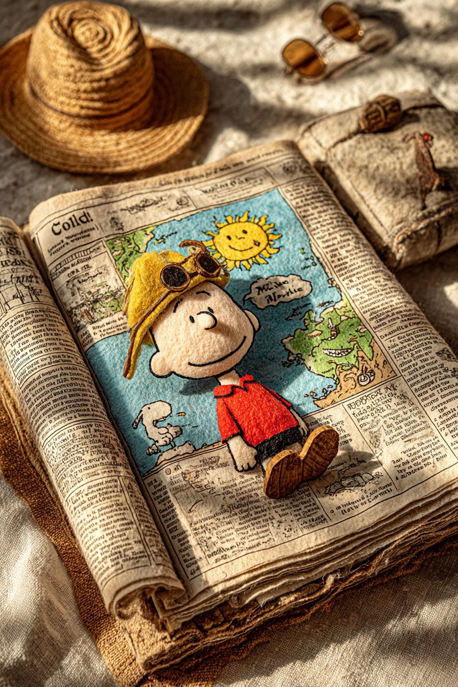 A newspaper titled 'Fake News' in a wool felt style features a story about Captain Columbus, played by Snoopy, discovering the New World. The New World is marked on a map in a specific location, with cinematic lighting effects and an interesting layout on the newspaper. The caption reads: 'Cool.' The image is very creative, with cute, funny doodles and high-definition details.