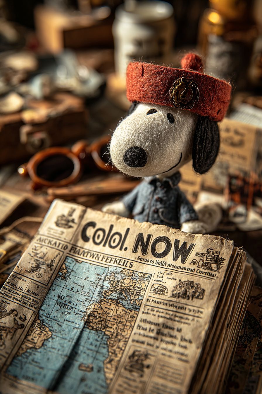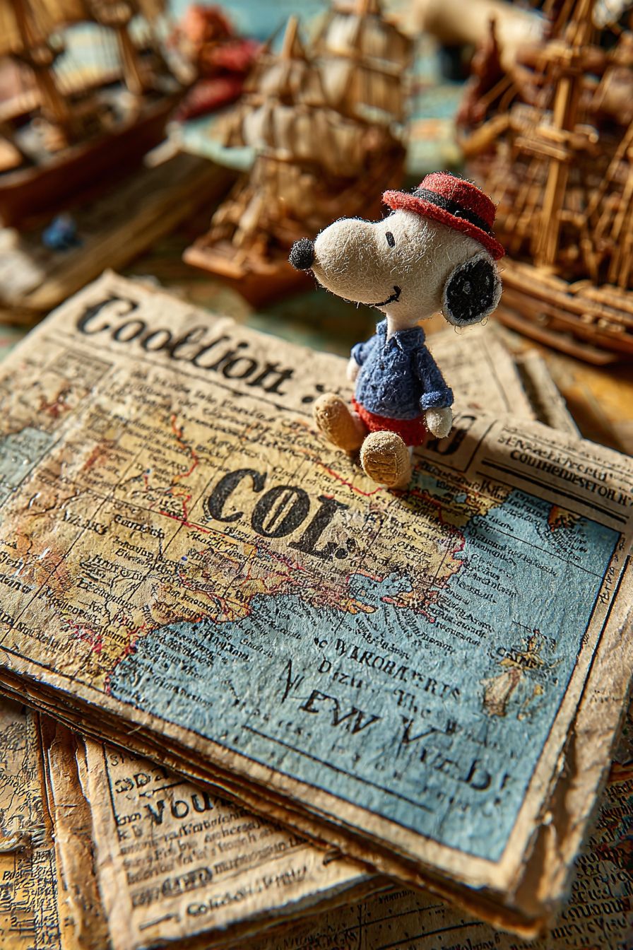 A newspaper titled "Fake News" in a wool felt style features a story about Captain Columbus, played by Snoopy, discovering the New World. The New World is marked on a map in a specific location, with cinematic lighting effects and an interesting layout on the newspaper. The caption reads: "Cool." The image is very creative, with cute, funny doodles and high-definition details. --ar 2:3 --v 7.0 --s 750