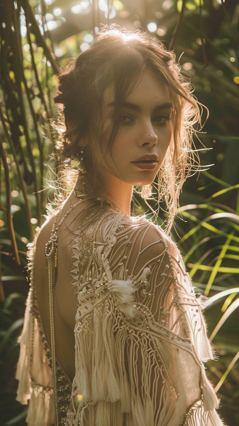 Boho-chic fashion shoot in a lush garden, with a model dressed in layered bohemian outfits, accessories with fringe and beads, captured in natural sunlight filtering through the trees, creating enchanting light and shadow play, natural skin texture, resembling magazine photography, soft focus, ultra detailed --ar 9:16 --v 6.0