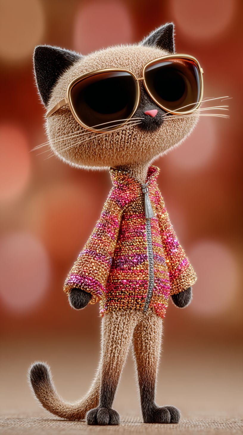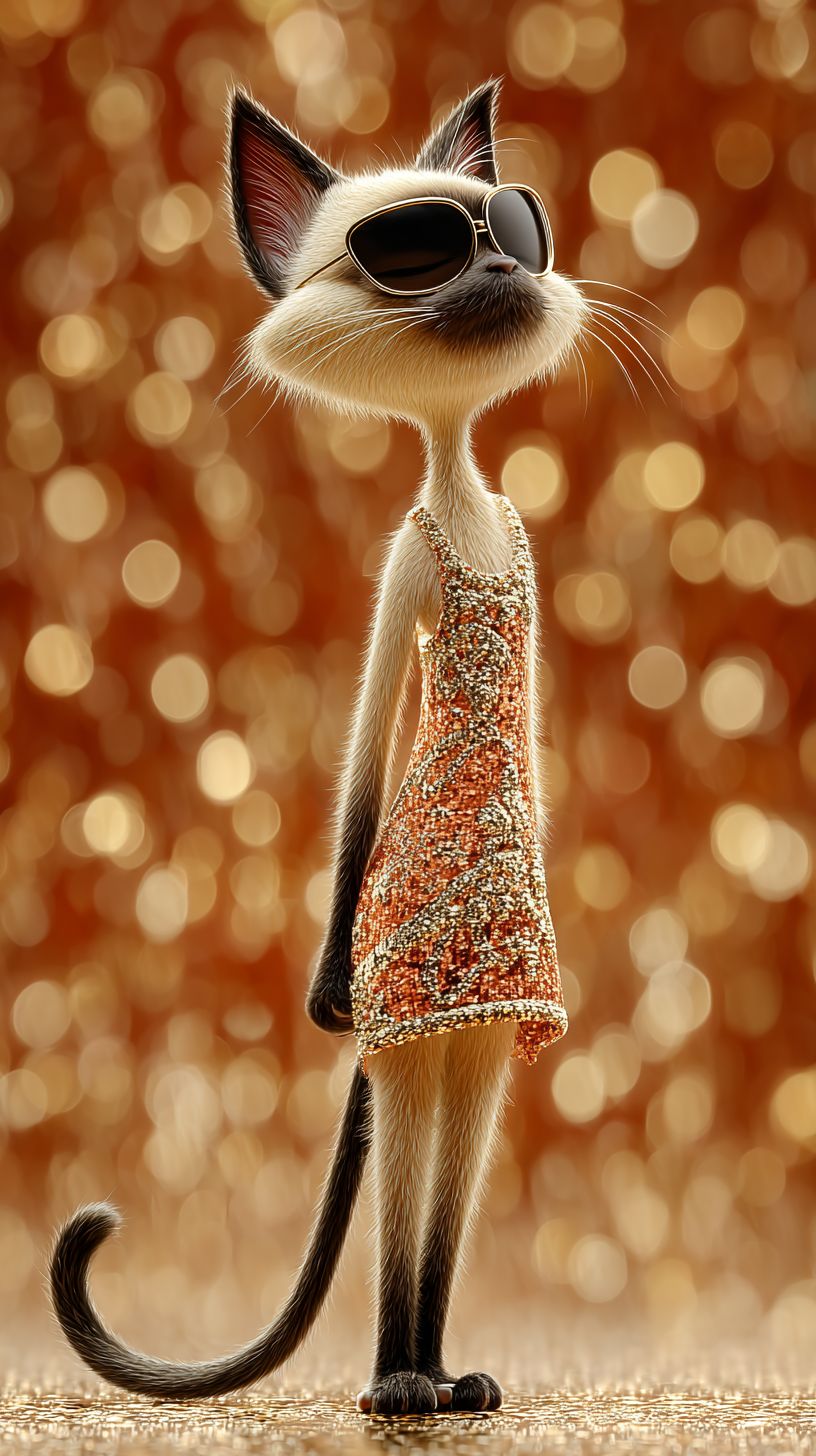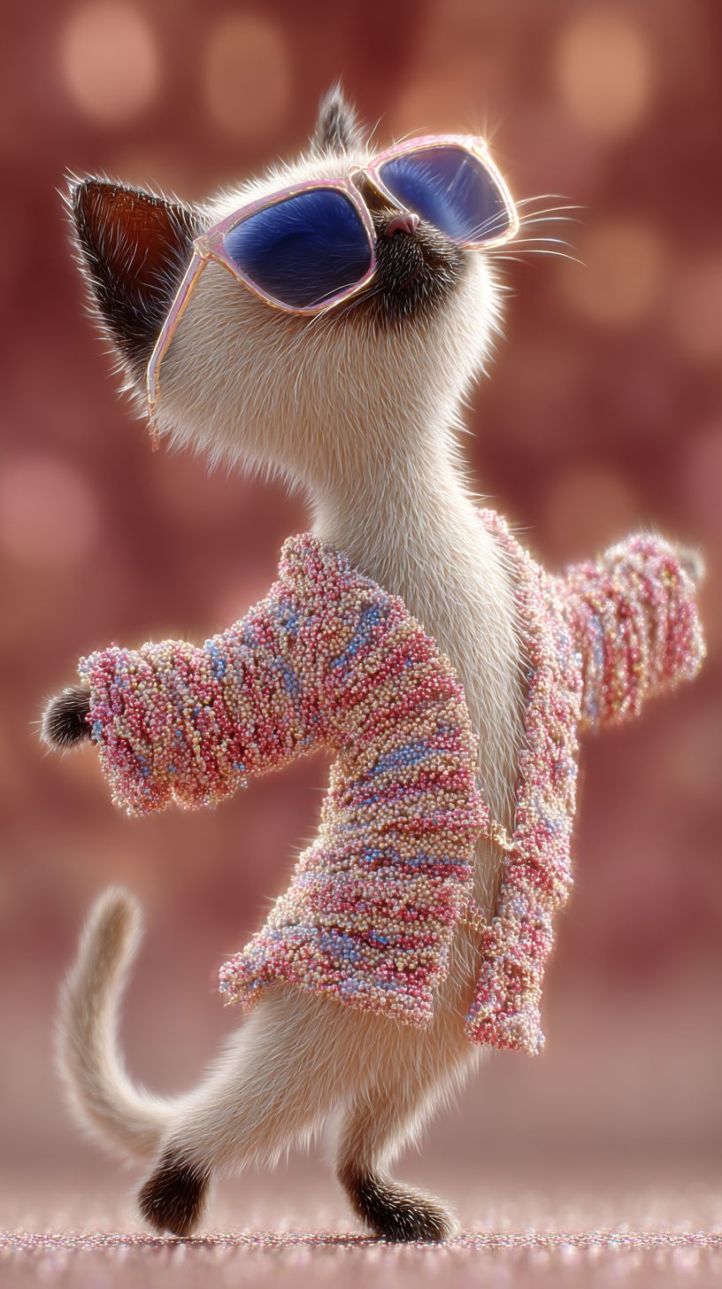 a sleek Siamese cat standing on two feet in a glittery samba outfit, sunglasses, spotlight stage, stylish and confident pose, 3D Pixar style --ar 9:16 --s 750