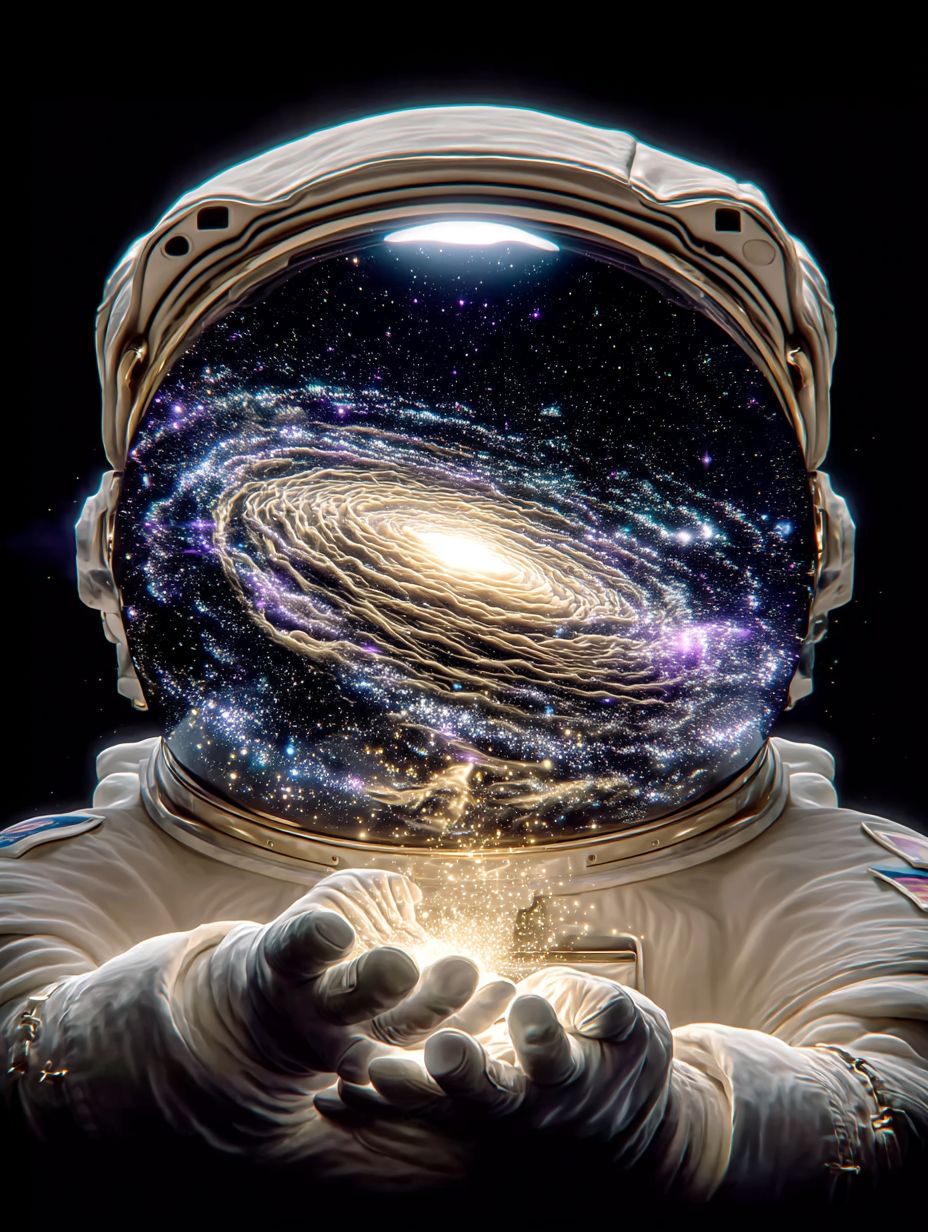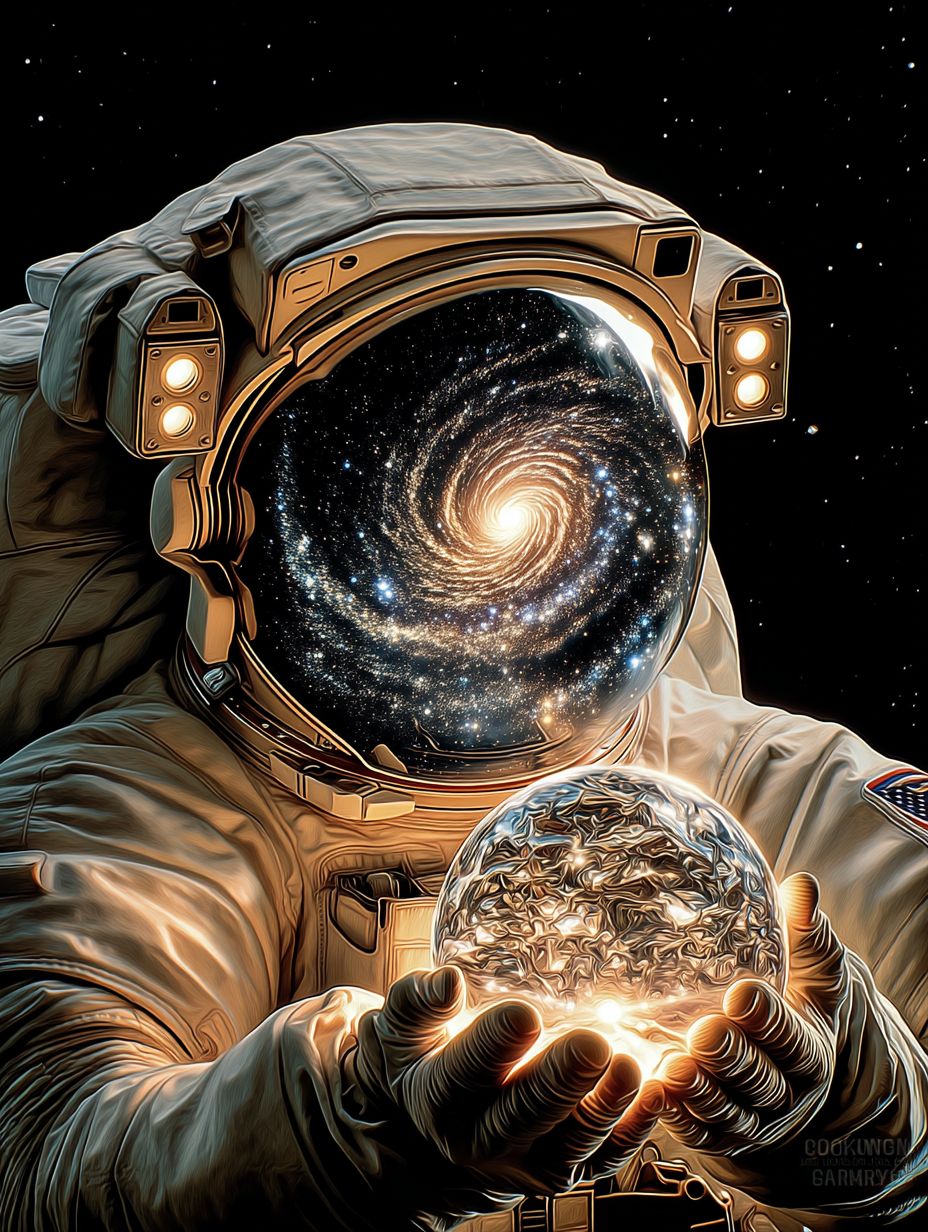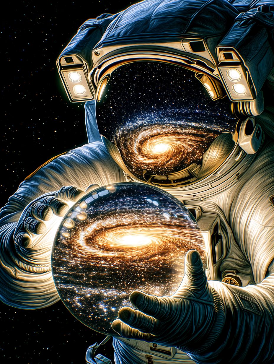 A lone astronaut floating in the vast silence of space, gently cradling a glowing glass orb in their hands. Inside the orb, miniature galaxies spin, black holes swirl, and stars are born and die in slow motion. The astronaut’s visor reflects cosmic light, surrounded by stardust and soft nebula mist, the void stretching endlessly behind them. A painterly composition with surreal, gothic elegance, high contrast lighting, soft glowing edges, mysterious and introspective, as if the universe has been captured in fragile crystal. 8k resolution, highly detailed, dreamlike.