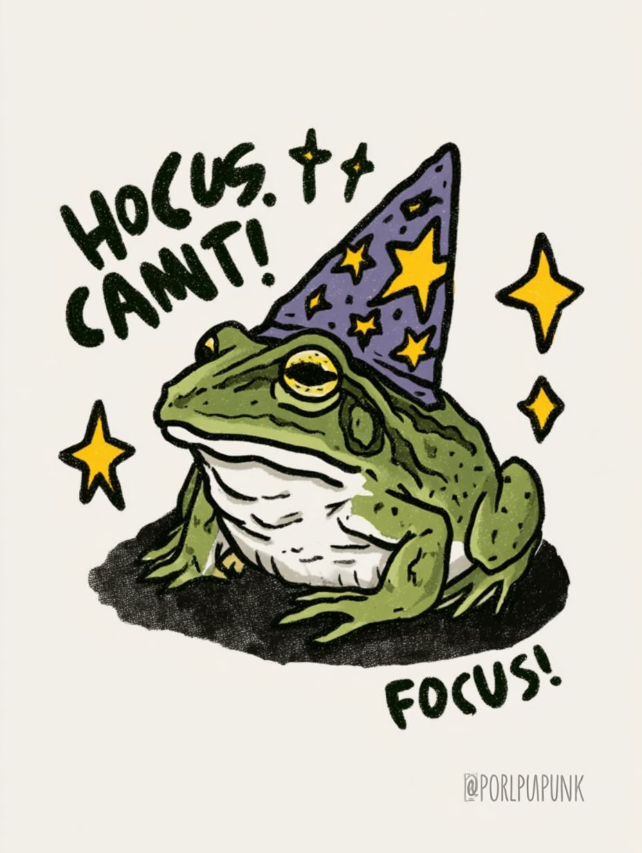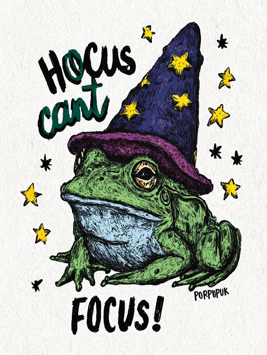 A whimsical cartoon illustration of a green frog wearing a wizard hat with yellow star decorations. The frog has a long nose and is drawn in a simple, hand-drawn style with thick outlines. The wizard hat is purple and triangular with yellow star embellishments. The text "Hocus can't" appears in dark green handwritten-style font at the top of the image, followed by "Focus!" in a similar style below. The artist signature "Popcornpunk" appears in small text beneath the frog. The illustration is set against a plain white background. Yellow stars are scattered around the frog, creating a magical atmosphere. The overall composition has a playful, childlike quality with a limited color palette of green, purple, and yellow. --ar 3:4 --profile 1afzln5 --s 750