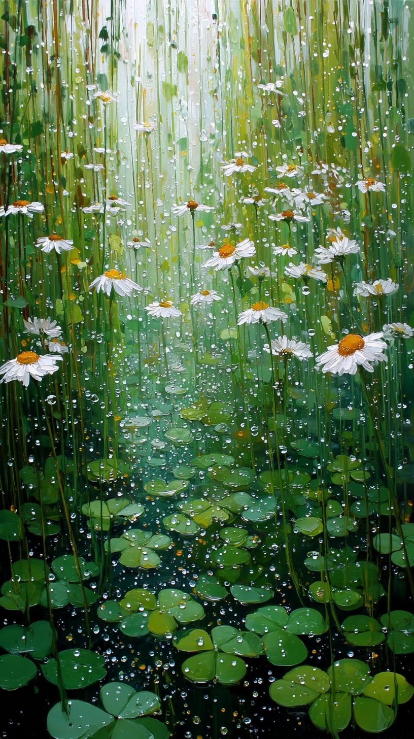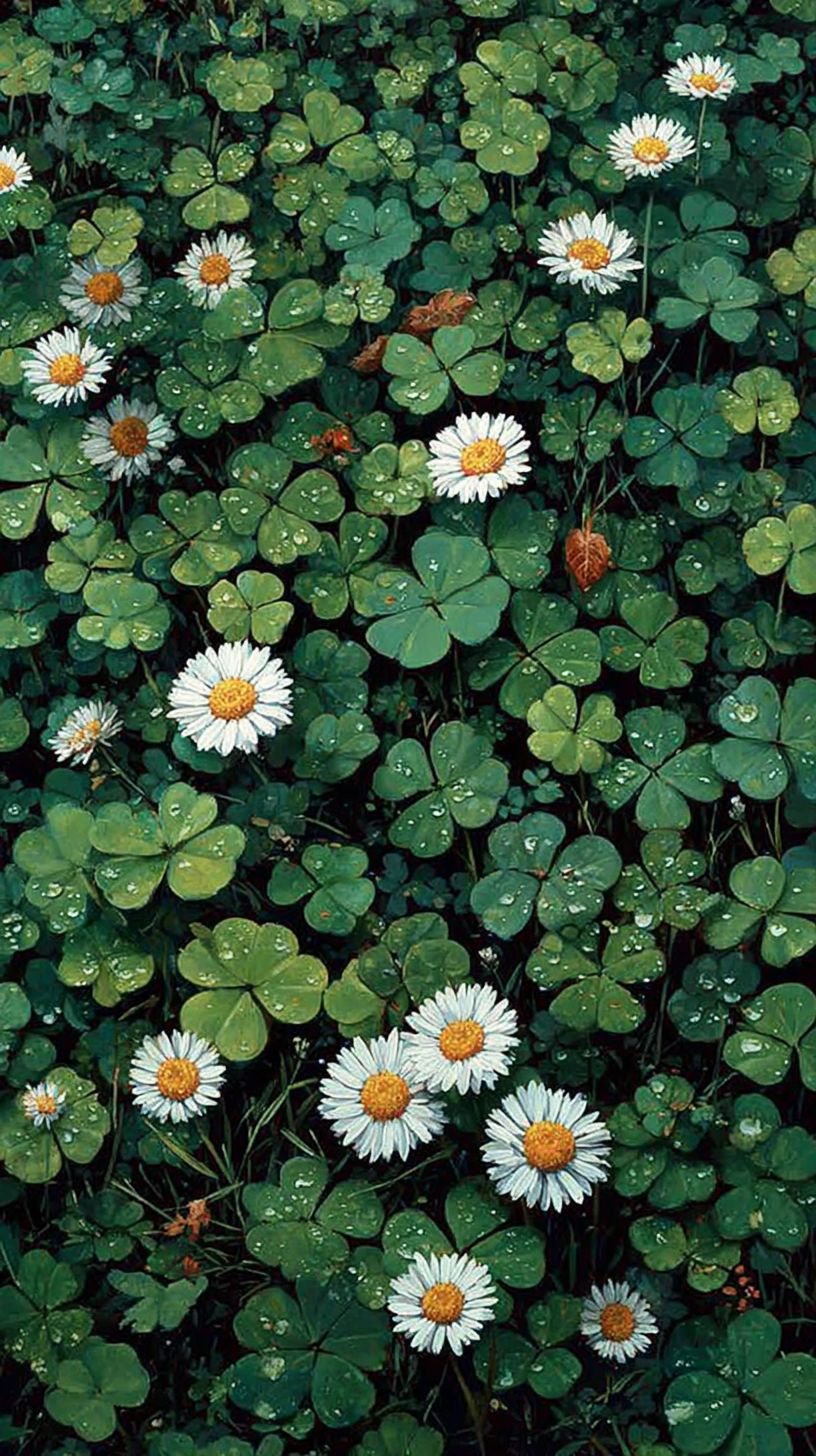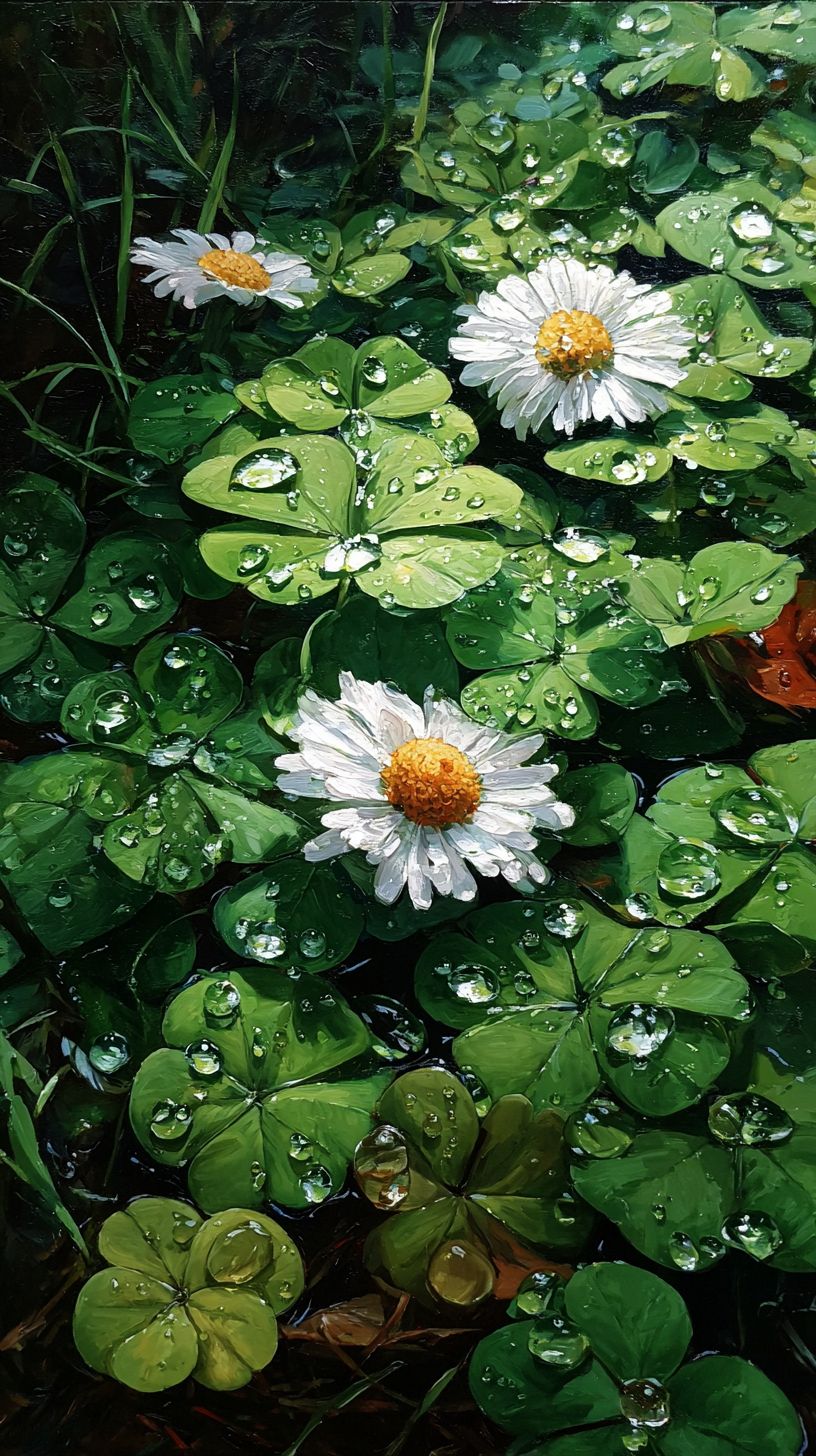 After a summer rain, four-leaf clovers sparkle with water droplets while white daisies exude a refreshing healing vibe