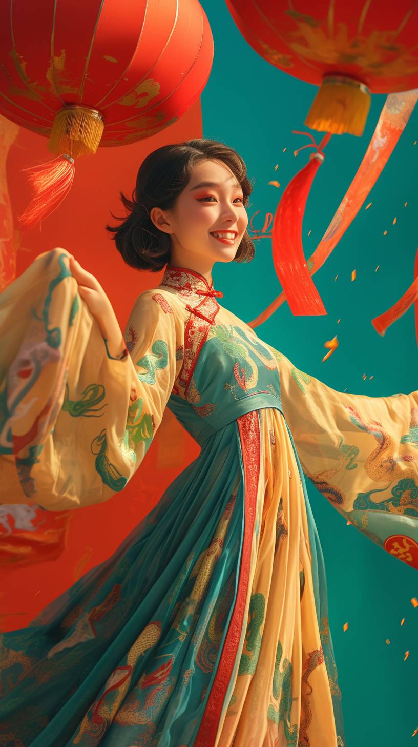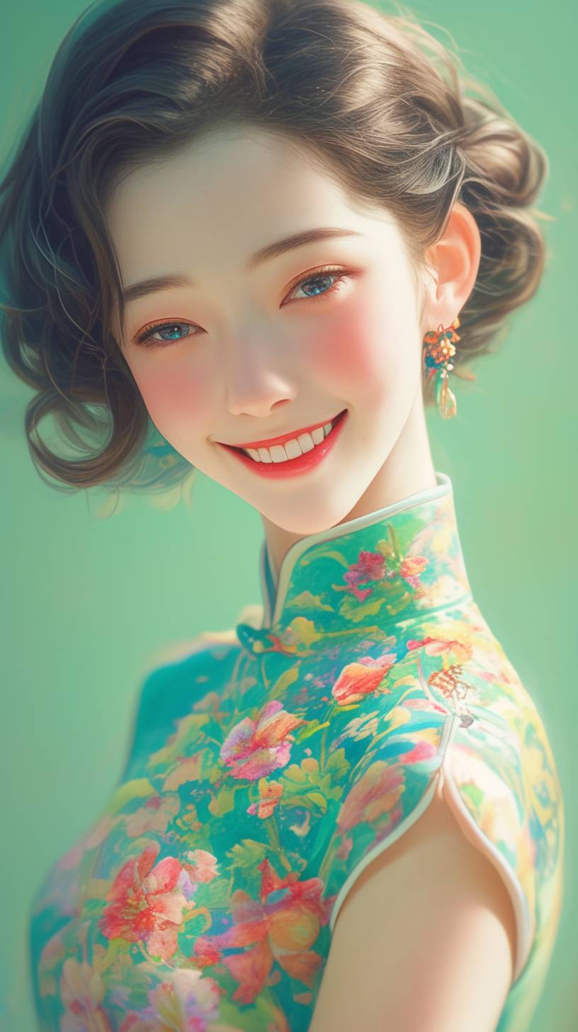 Chinese girl, dress, full-body shot, real photography, smile, short hair, UHD, 6k, portrait, smiling, vibrant colors, professional photograph, playful, lively, energetic, happy, traditional clothing, traditional Chinese dress, modern twist, contemporary fashion, Asian beauty, youthful, carefree, joyful::1 glasses, frowning, dark, gloomy::-0.5 --ar 9:16 --niji 6