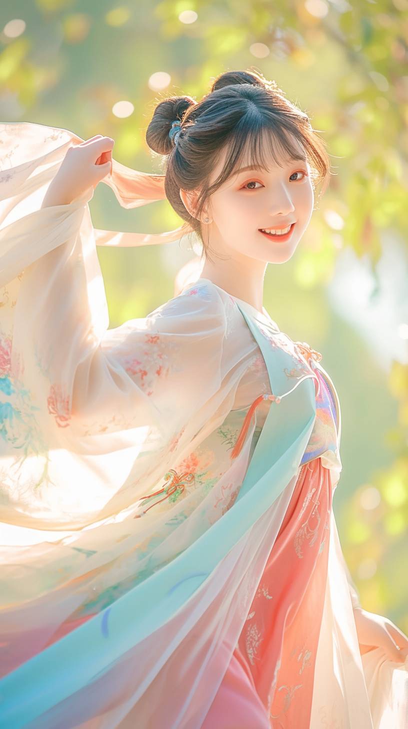 Describes a happy girl in traditional Chinese dress, showcasing a youthful and vibrant spirit.