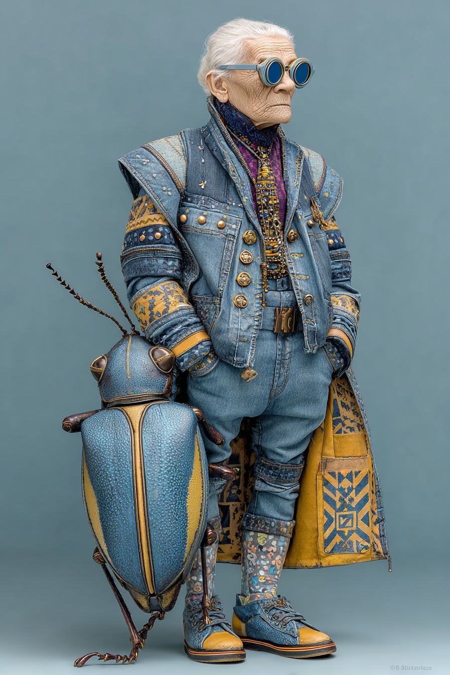 A full-length photograph of a realistic beetle with a short dumpy old lady human body dressed in current modern street fashion.