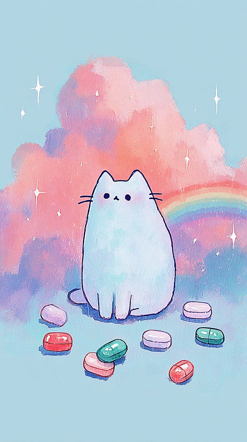 A simple doodle of Pusheen the cat is taking omega 3 fish oil, with a pastel sardines and mackerele background featuring subtle watercolor textures and dreamy rainbow hues. --ar 9:16 --sref 3345 3375 --profile rvqdp9k wmxrfe4 --s 750