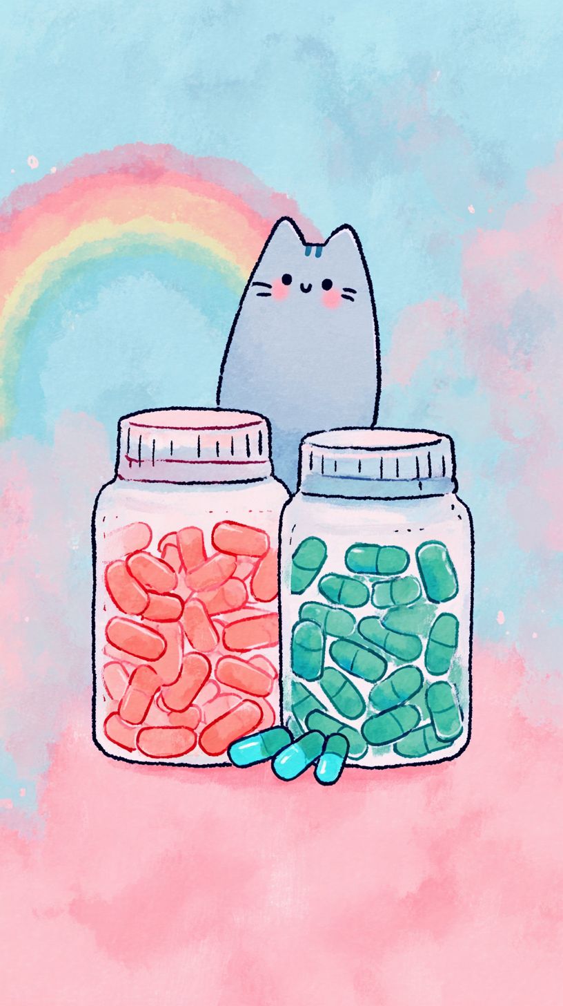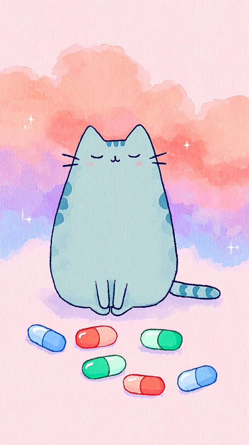 A simple doodle of Pusheen the cat is taking omega 3 fish oil, with a pastel sardines and mackerel background featuring subtle watercolor textures and dreamy rainbow hues.