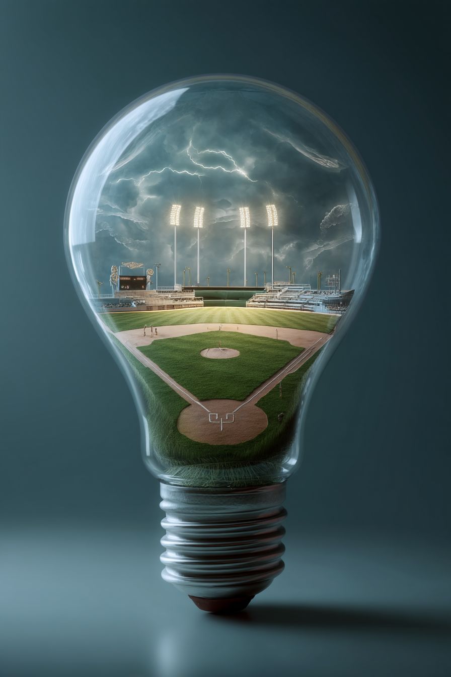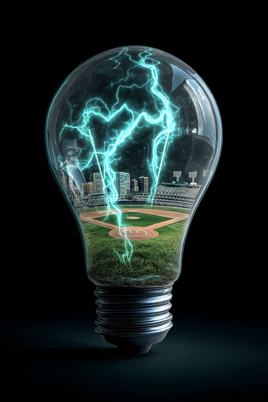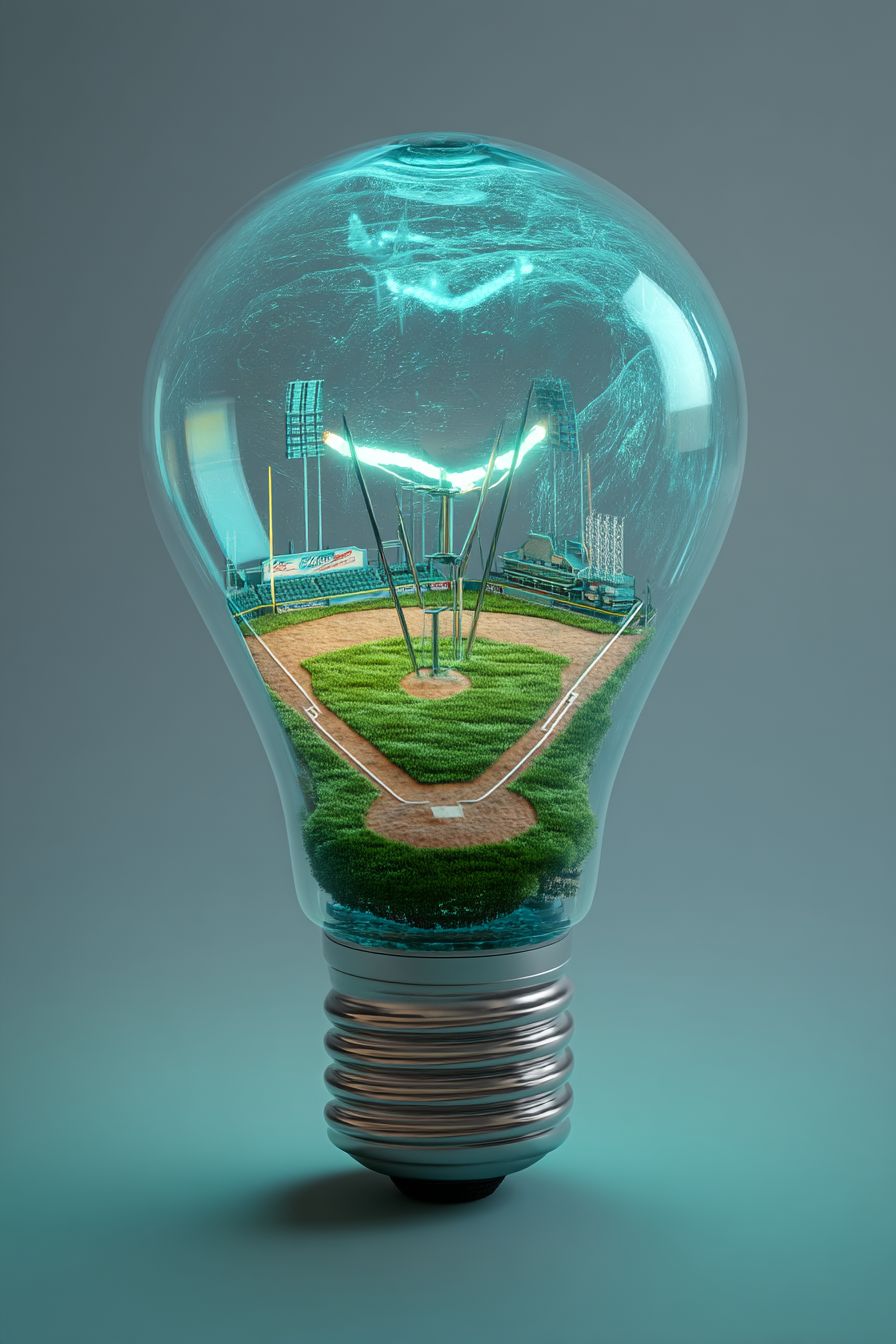 A light bulb with an old-school baseball field inside, an electric bluish current flows into the bulb, giving the baseball field glowing energy, green and positive, illuminating a green future.