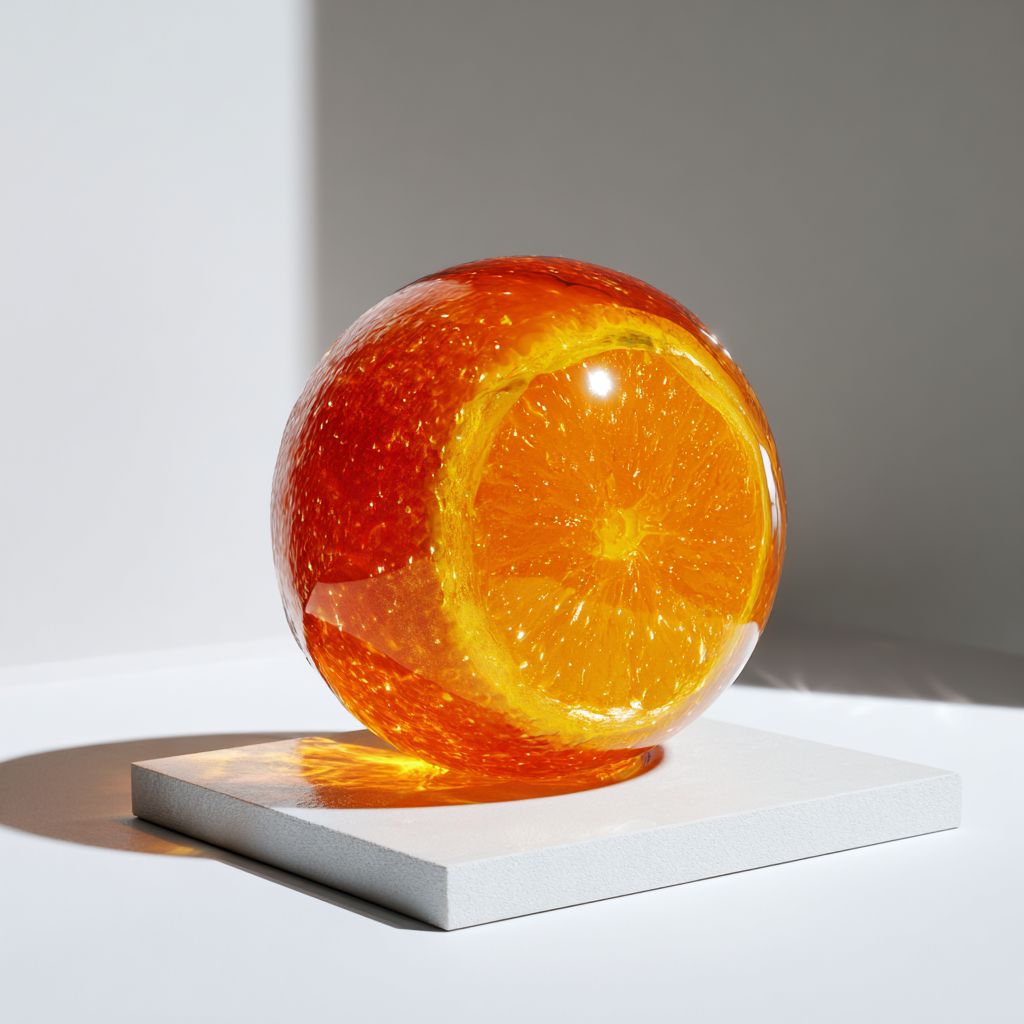 The orange features a hyperrealistic transparent crystalline structure with a glossy finish