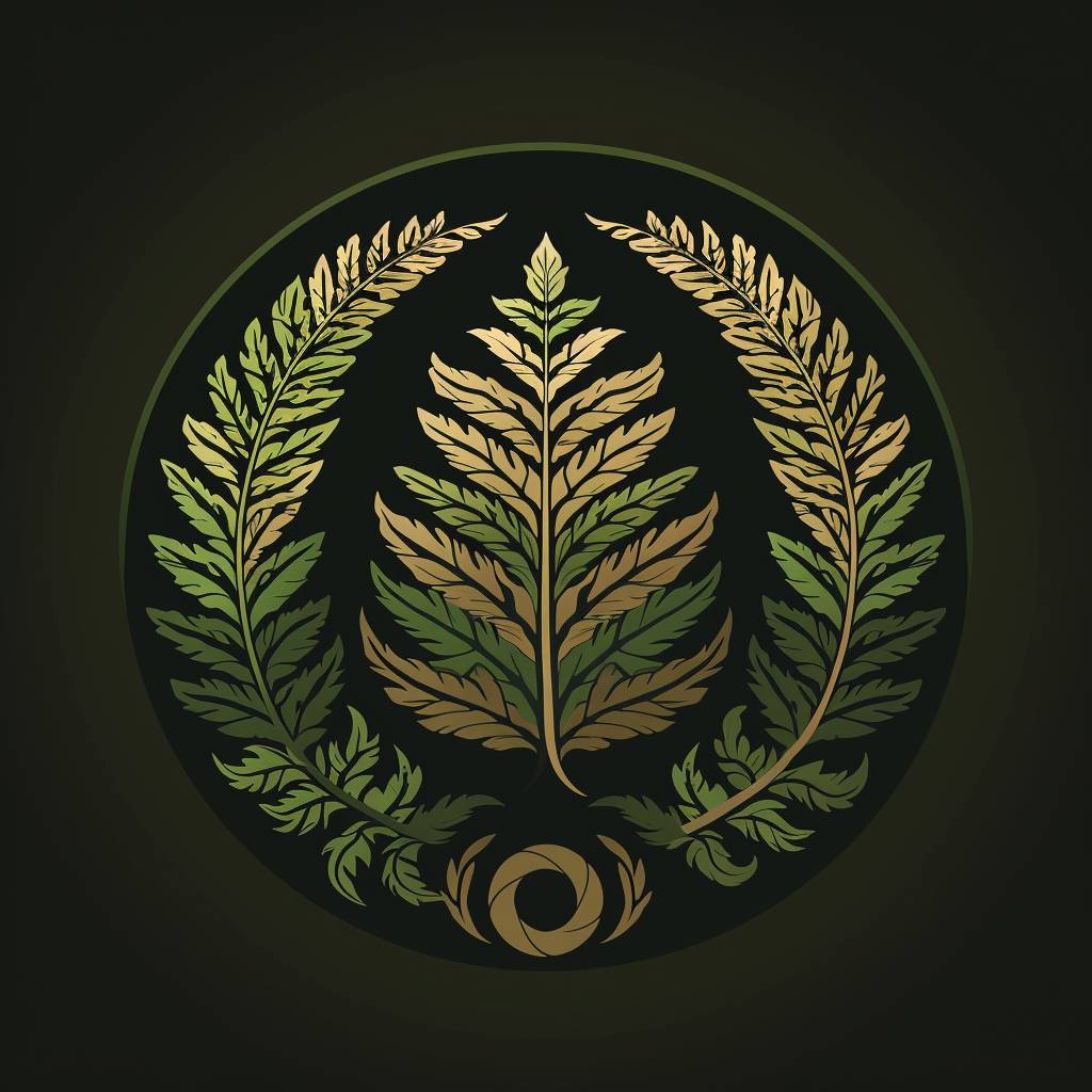 Modern New Zealand elemental logo, simple, dark background, featuring ferns in an art style.