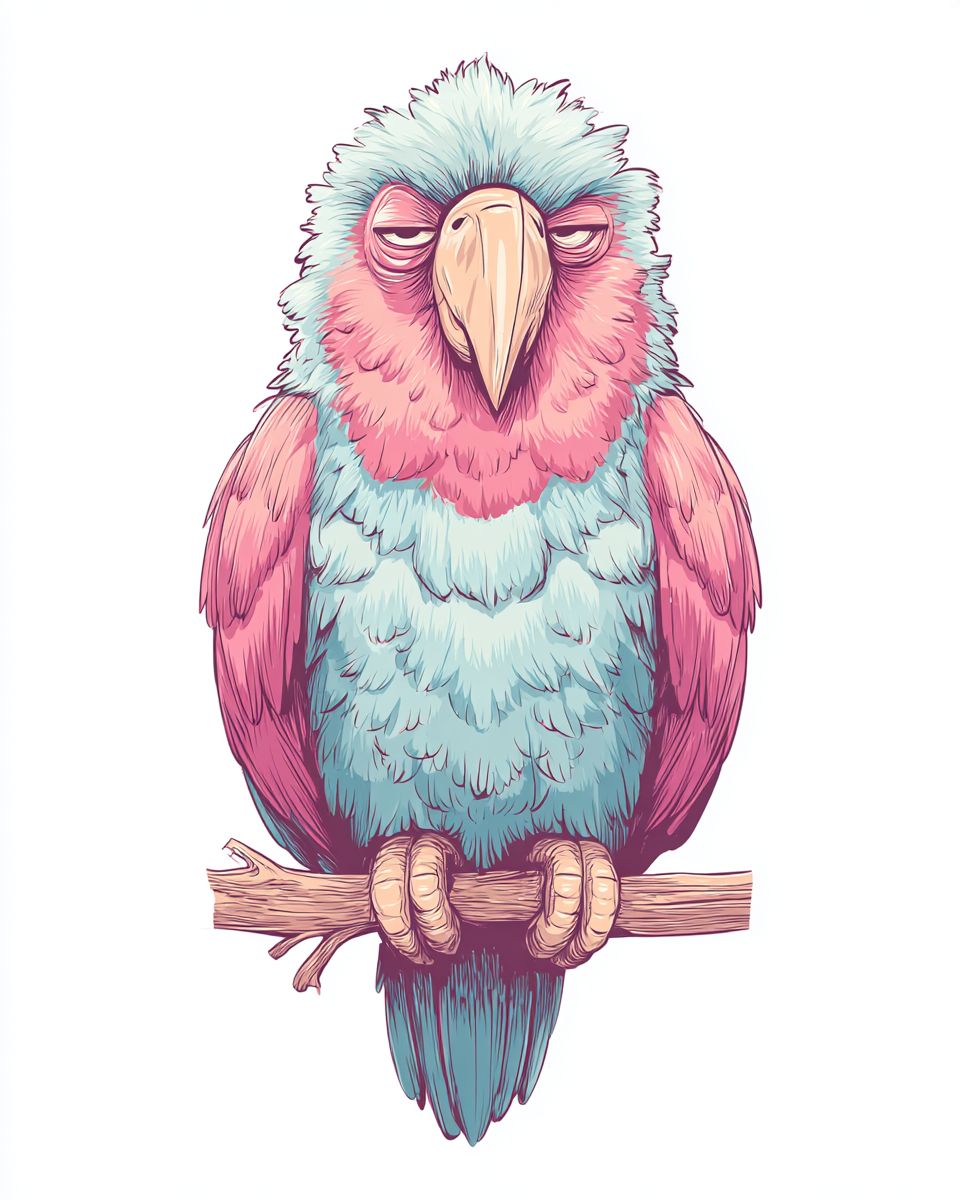 A colorful and a little disheveled parrot with a tired expression, sitting on a perch, minimal naive illustration, soft vintage pastel colors, thick outlines, eye bags, humorous tone, blank background, children book style, t-shirt vector design, centered composition.