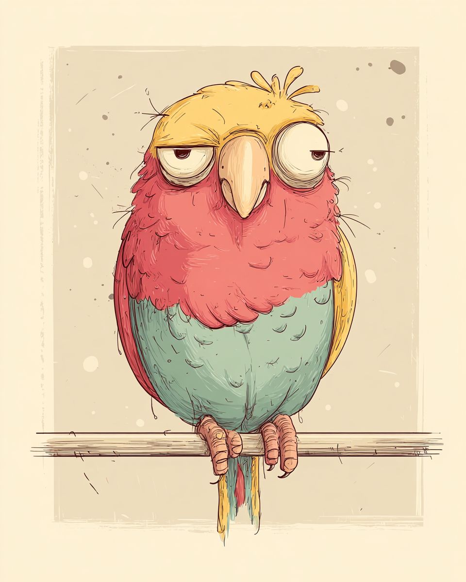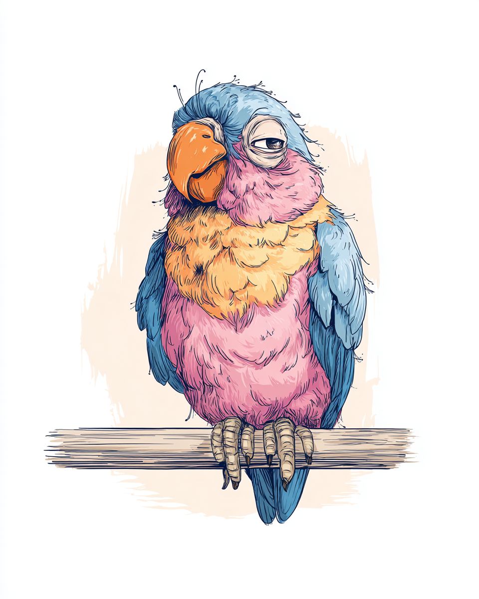 a colorful and a little disheveled parrot with a tired expression, sitting on a perch, minimal naive illustration, soft vintage pastel colors, thick outlines, eye bags, humorous tone, blank background, children book style, t shirt vector design, centered composition --ar 4:5 --raw --v 7.0
