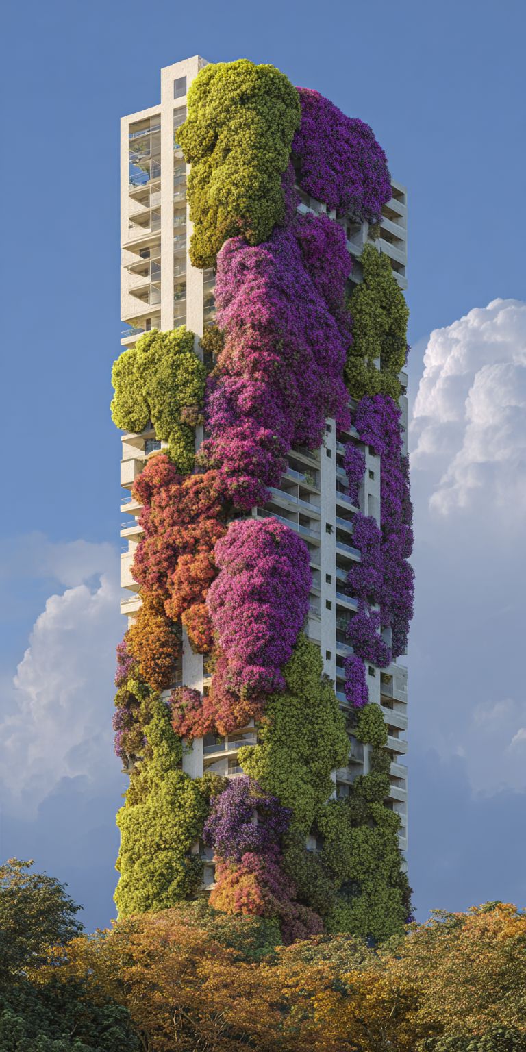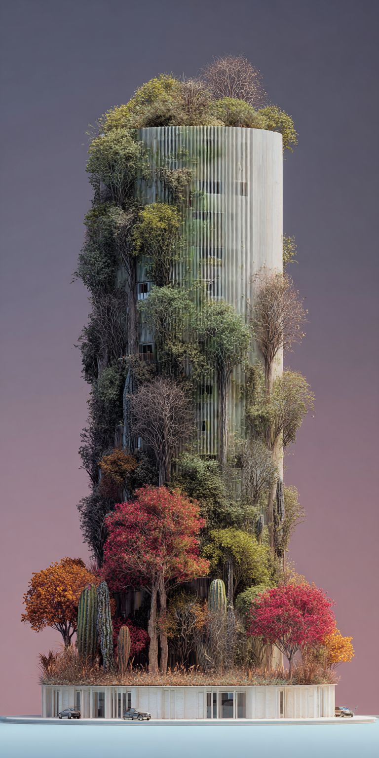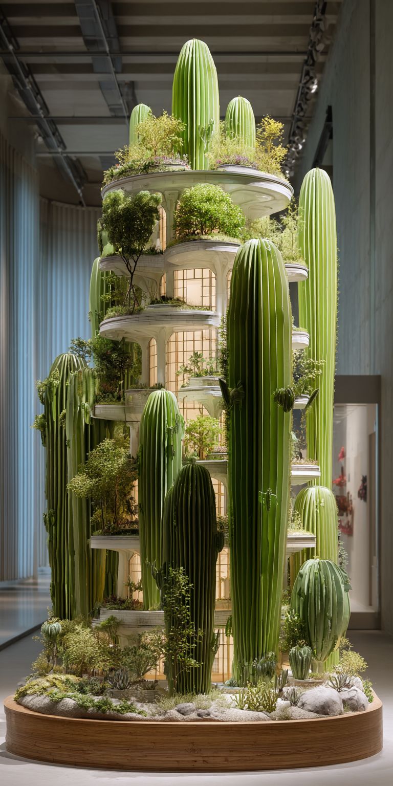 hyper realist full picture of podium and 50 storey cactus cilinder shaped colorful green neon lime and lilac whitewashed minimalist stefano boeri with dried trees skyscraper with recessed balconies filled with dried deciduous semi-arid trees on a cumaru, xique-xique and ferro color tones razilian caatinga semi-arid vegetated landscape, clean sky, optics architectural inspired ornaments like eyelids, eyeshadows, lens, eyelashes, cornea, glasses lenses and frames, aerodynamics lines --ar 1:2