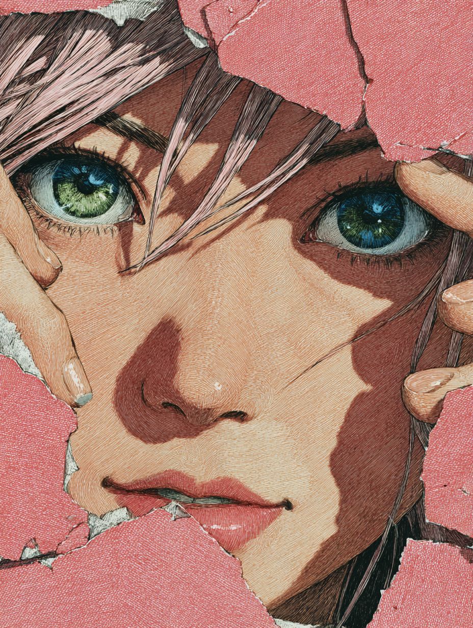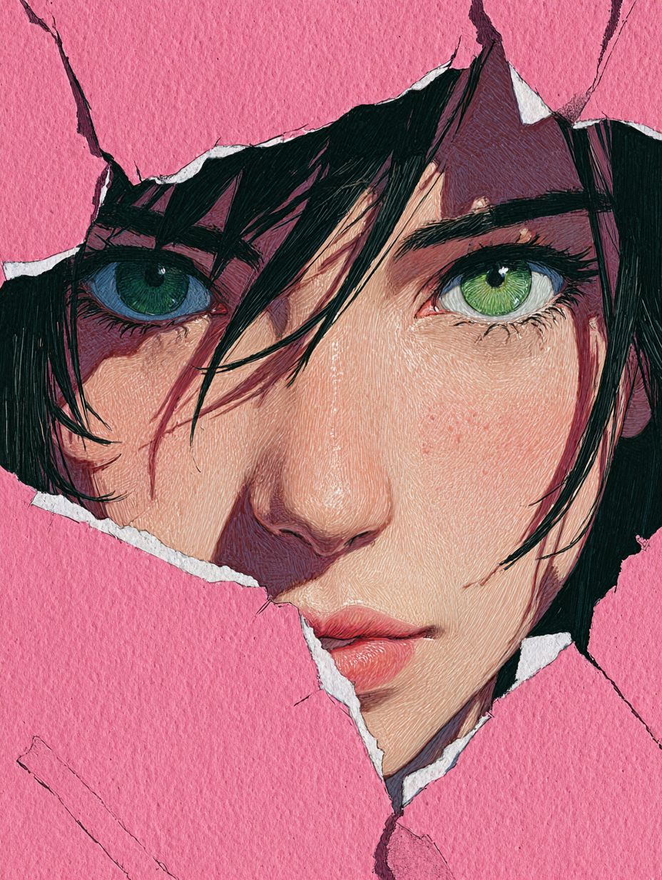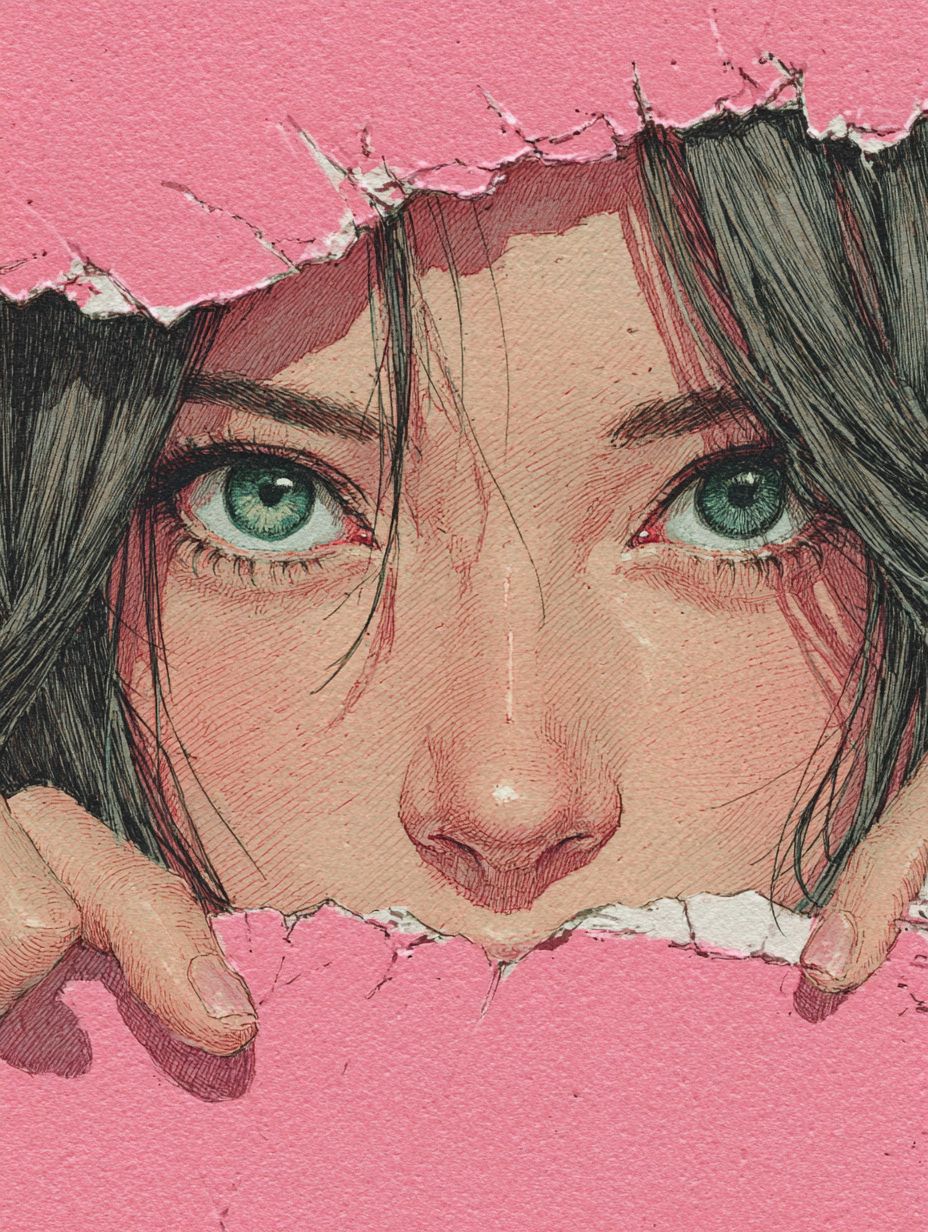 rinoa from final fantasy 8, Her eyes look at the camera through two fingers, peeking out from the edge of light pink paper with ripped edges. light pink hair. The background is a solid light pink, creating a striking contrast that emphasizes both her face and legs in high detail. Her green eyes have a soft glow effect, adding depth to the scene. This illustration style brings focus to the subject while maintaining simplicity and elegance, making it suitable for various applications, such as character design or animation. detailed colored pencil drawing, above the shoulders, this artwork is inspired by the manga style of Shin ichi Sakamoto. Emphasis on clean lines to capture movement and depth in the illustration. Use bold shadows to contrast light and dark areas. Pursue high resolution and ultra-realistic appearance. --ar 3:4 --raw --s 250