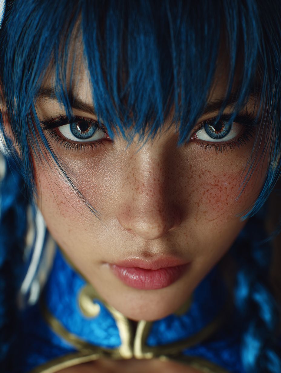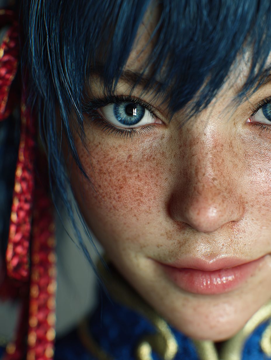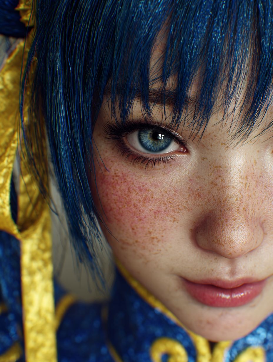 A photorealistic girl with natural skin texture in a Chun Li cosplay costume of an anime heroine. Dark blue hair. Close-up. She smiles with her eyes.