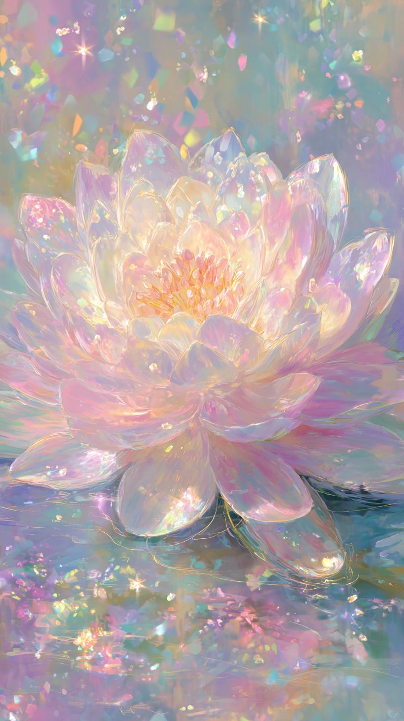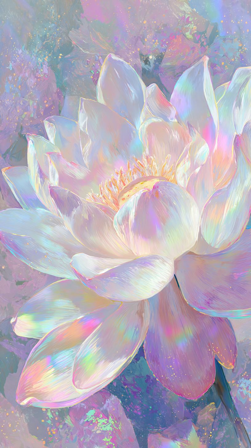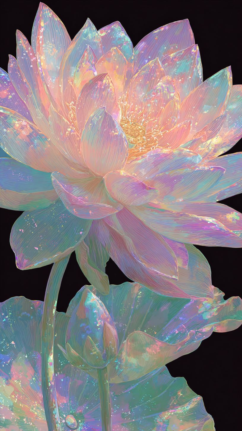 Illustration style featuring large lotus flower and rainbow diffraction patterns
