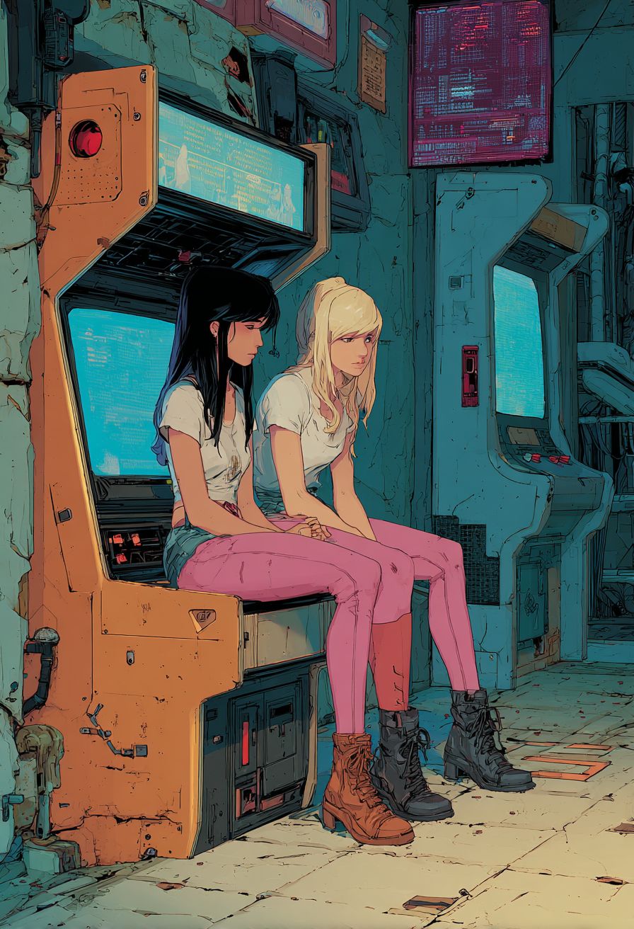 A blonde woman with bangs wearing pink leggings sits on the edge of an arcade machine. Next to her is another girl in a white t-shirt, wearing boots and having black hair, in the style of Moebius, Tomer Hanuka, and Martin Ansin, full body, high resolution.