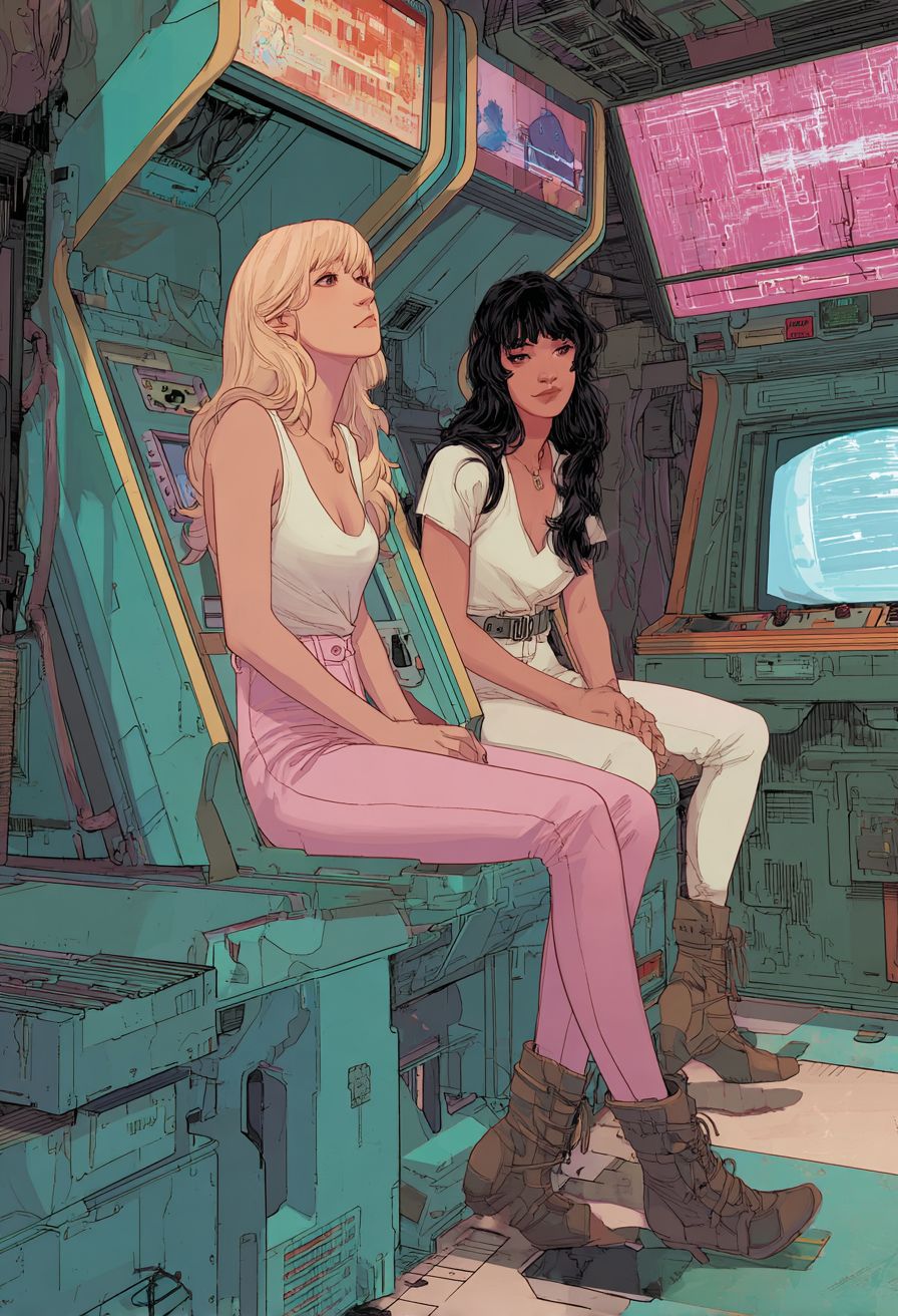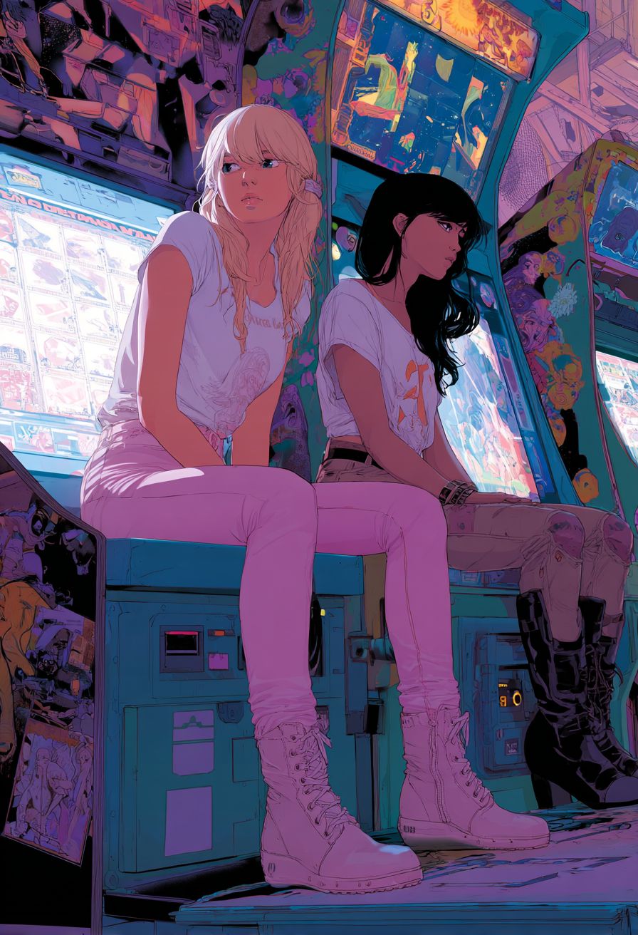 A blonde woman with bangs and pink leggings sits on the edge of an arcade machine. Next to her is another girl in a white t-shirt, wearing boots and with black hair, in the style of Moebius, Tomer Hanuka, and Martin Ansin, full body, high resolution. --ar 87:128