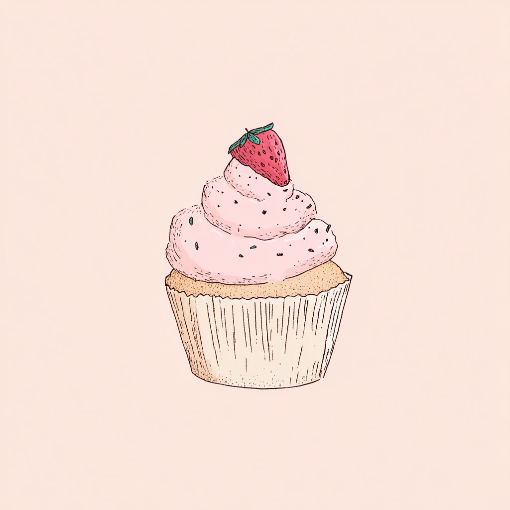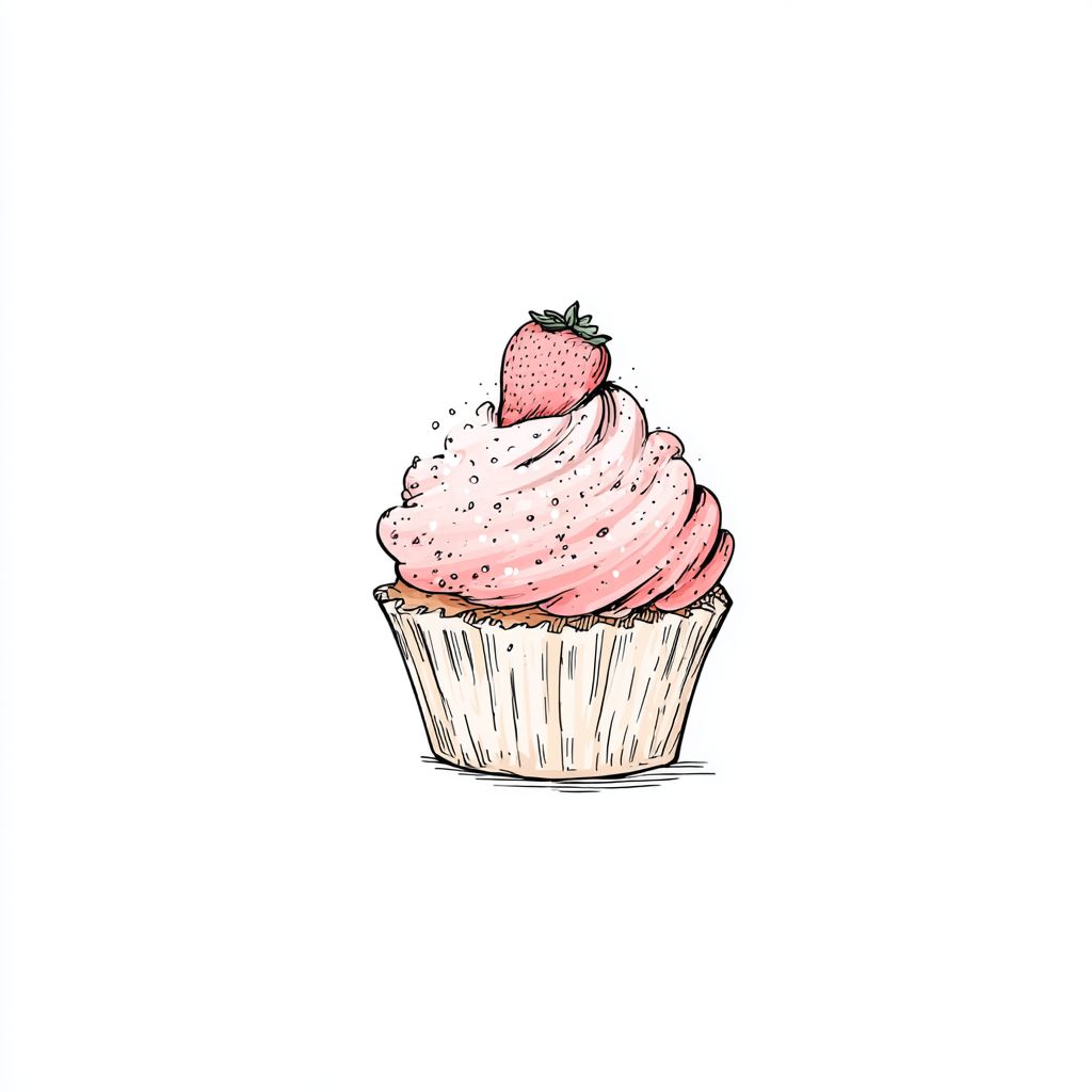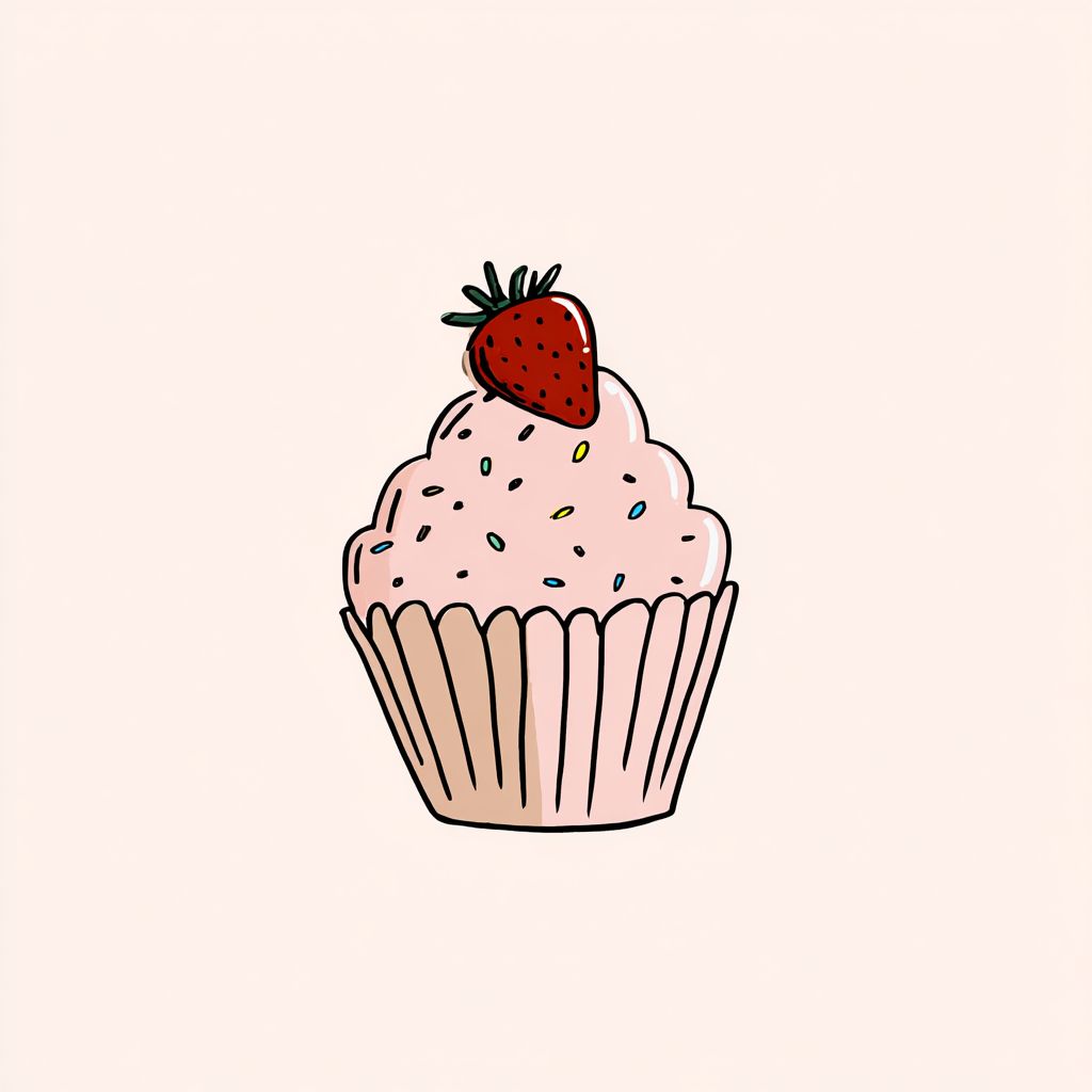 hand-drawn doodle and line art, strawberry cupcake, simple, soft pastel colors, no shading, whimsical tone, isolated on a crisp white background