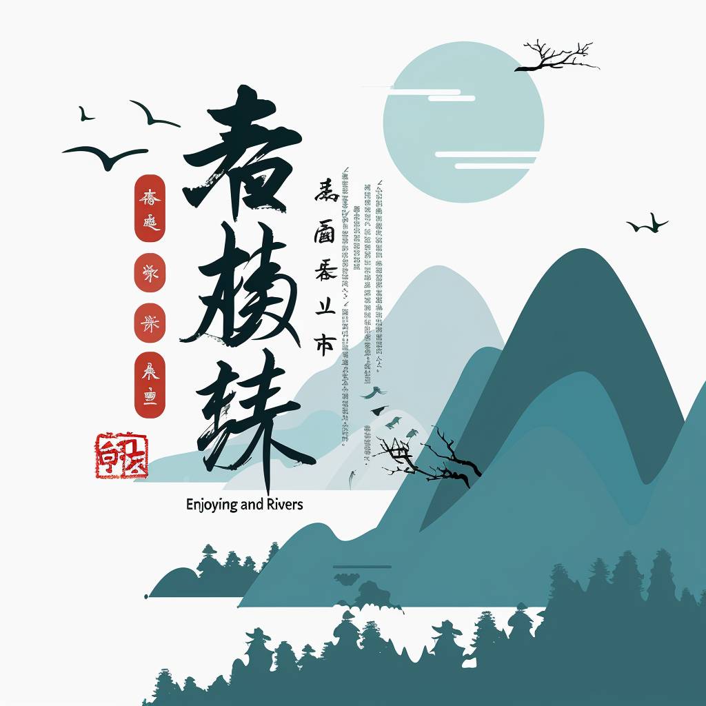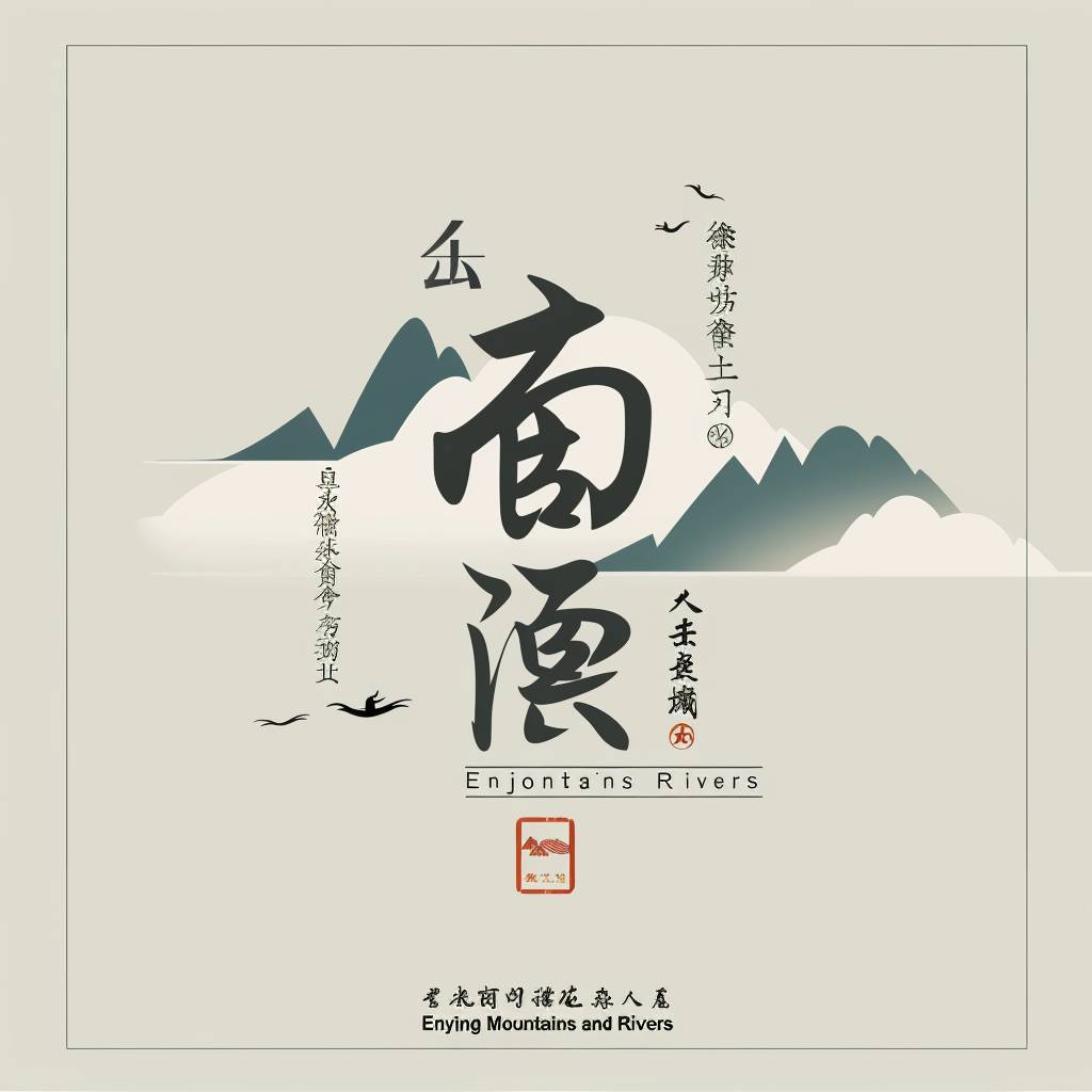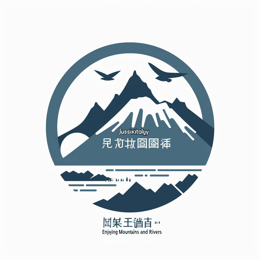 Design a simple 2D logo in Chinese style featuring the phrase 'Enjoying Mountains and Rivers', with a white background and flat design aesthetics.