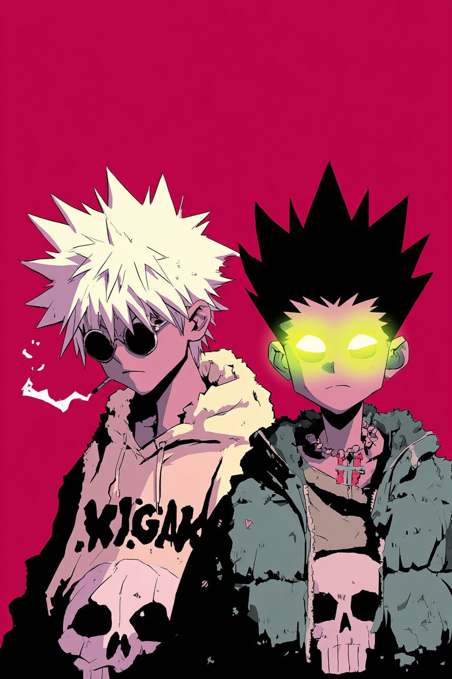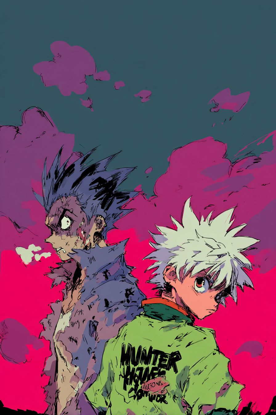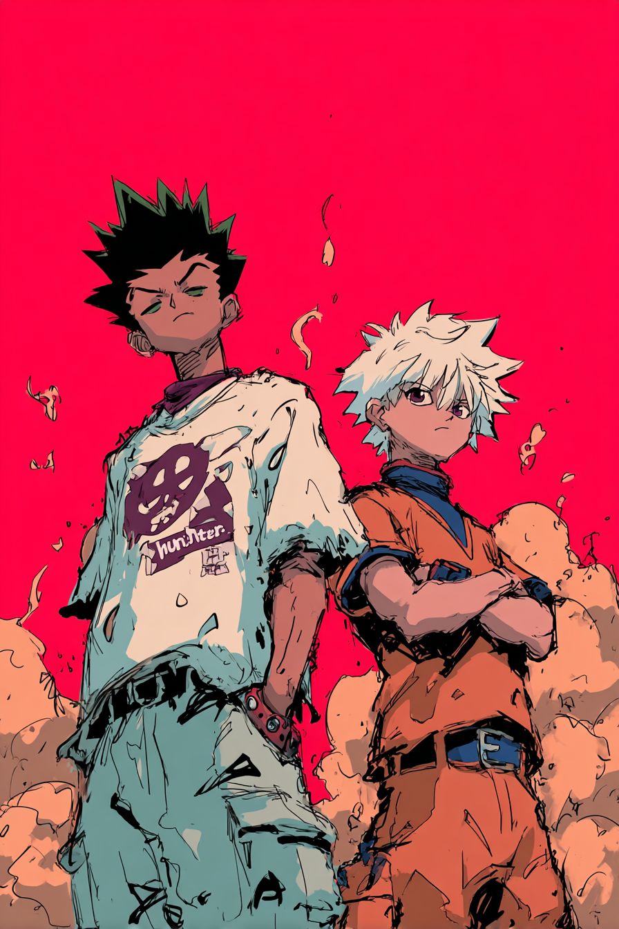 a poster for 90s hong Kong action movie about killua and gon with the title " hunter x hunter " directed by John woo --ar 2:3 --raw --profile lqaaj46 --v 7.0