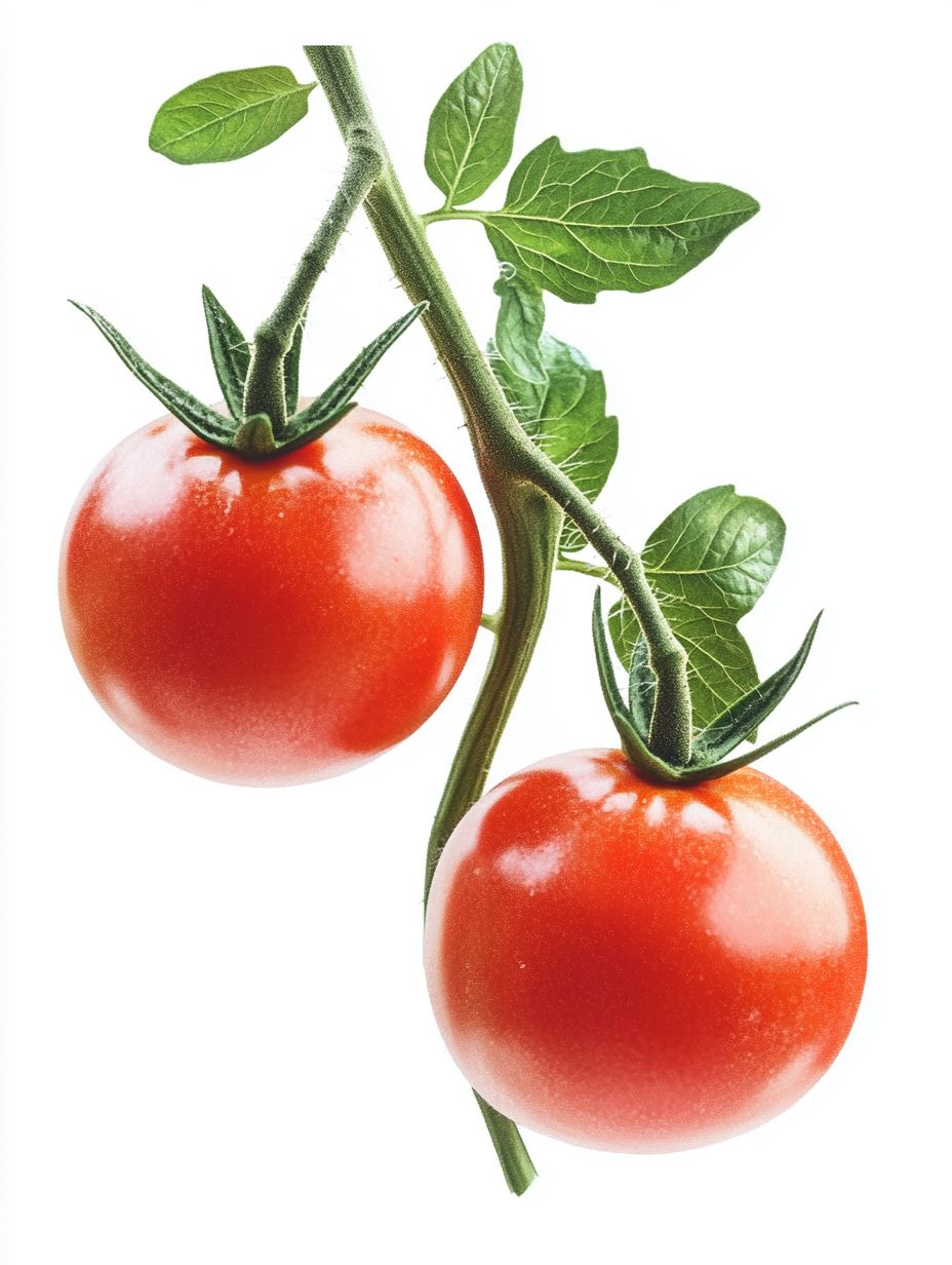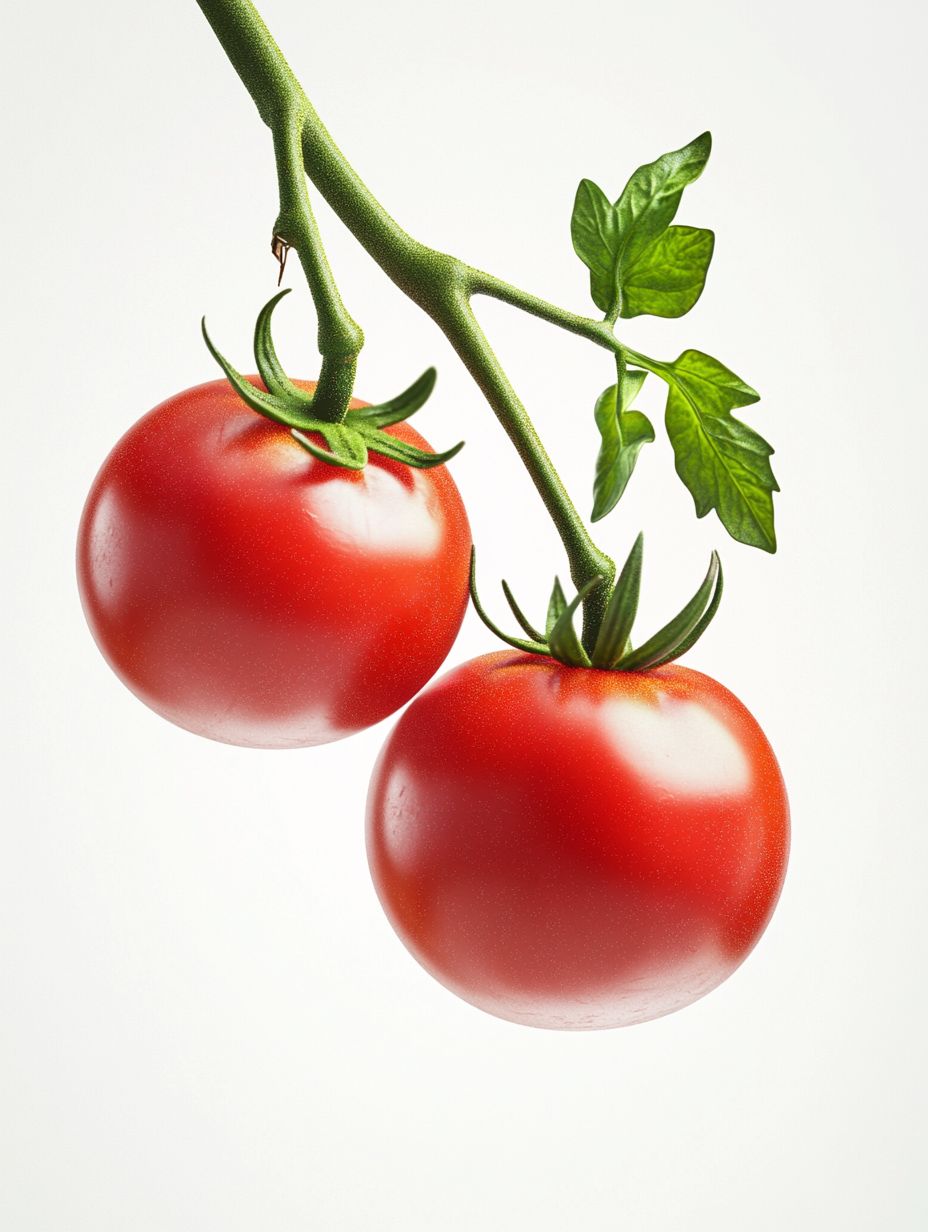 On a clean white background, a realistic branch of a tomato plant with two glossy, round red tomatoes hanging from a fresh green vine. The vine is slender with several bright green leaves attached, arranged naturally, similar to a botanical study. The tomatoes are smooth and shiny, with subtle highlights and natural imperfections to emphasize realism and freshness. Realistic Photography food style, high resolution, crisp details, soft natural daylight, minimal shadows. --ar 3:4 --v 6.1