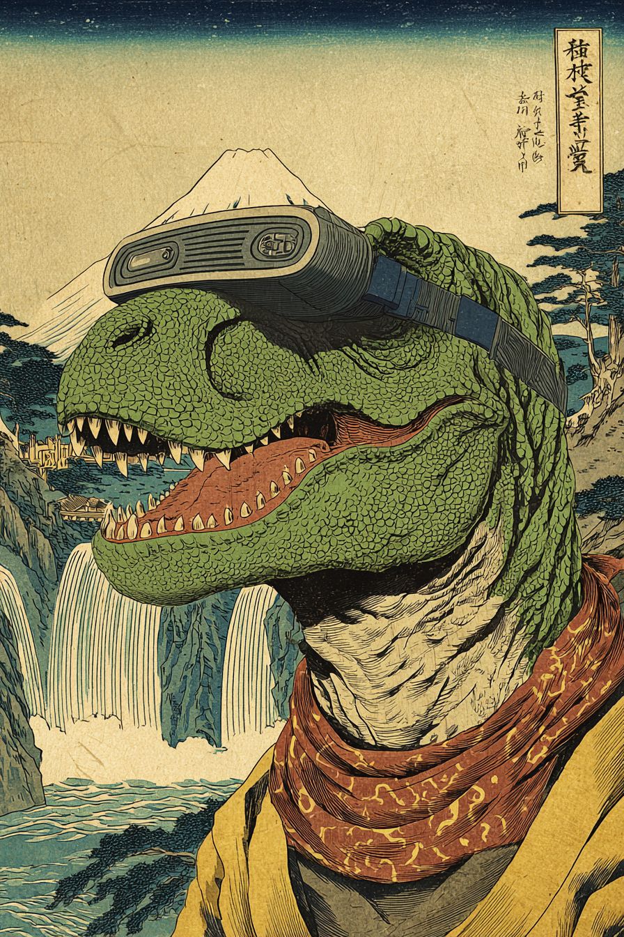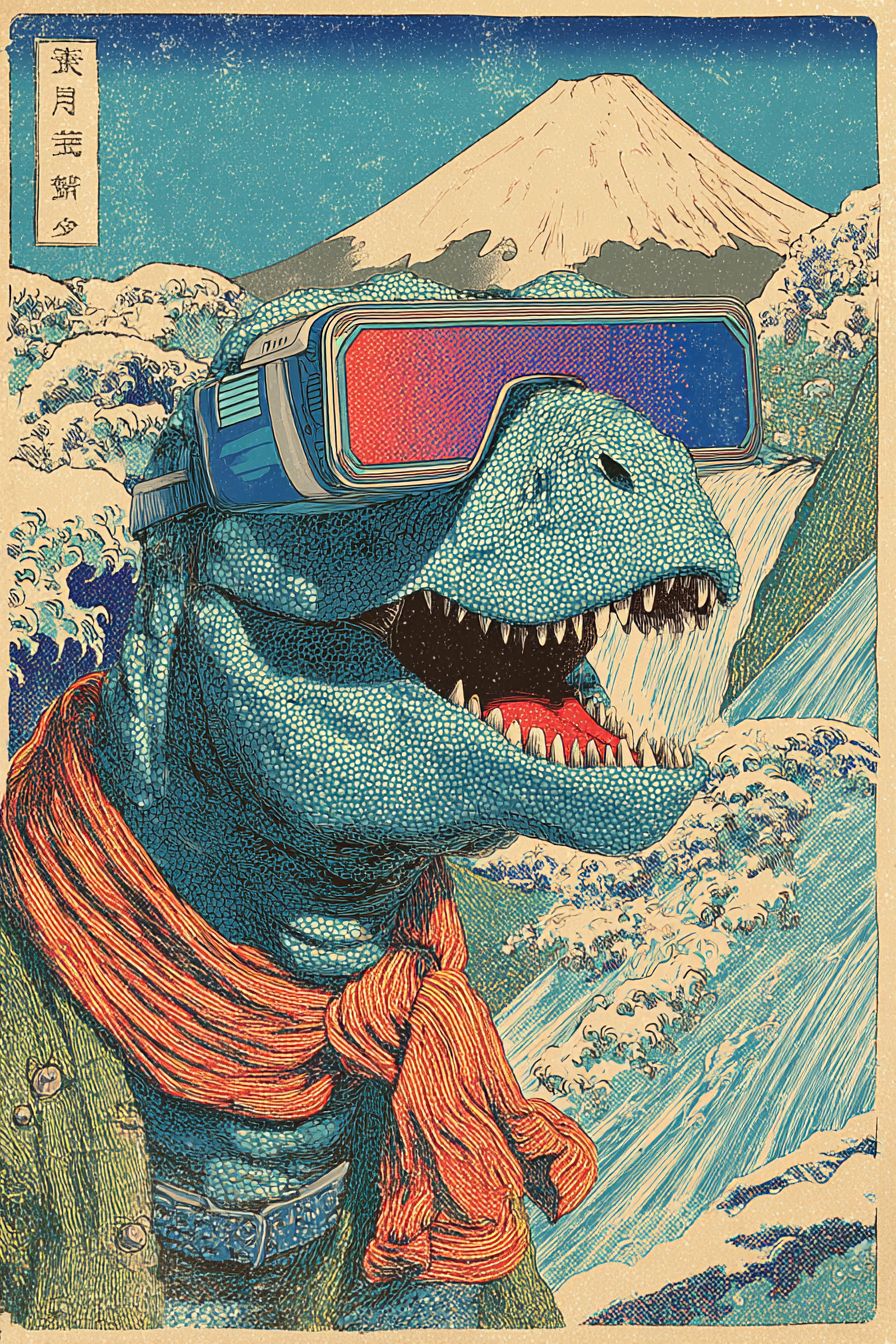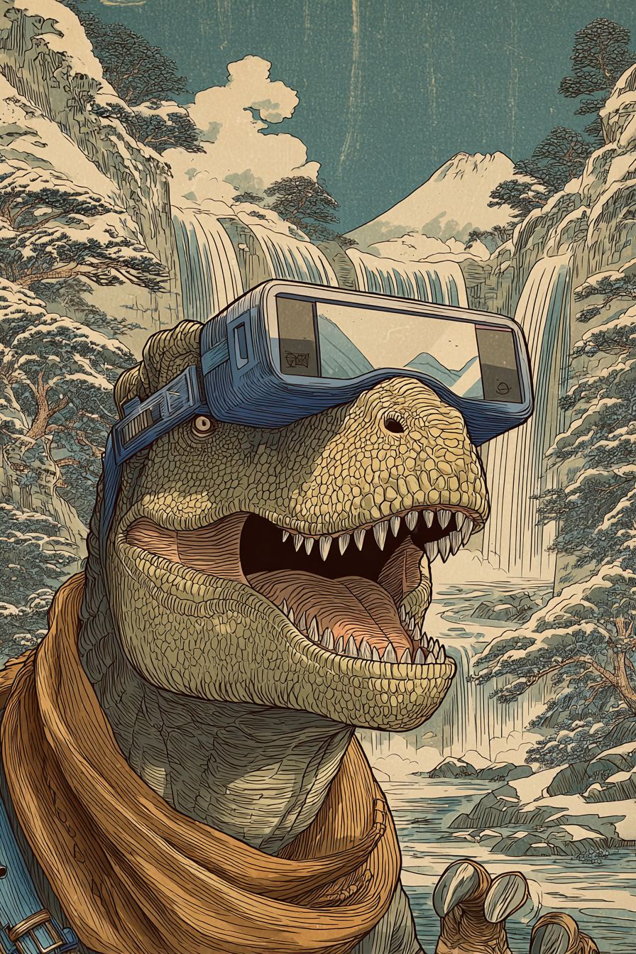 A happy T-Rex wearing advanced VR headsets and a scarf in a Japanese landscape with a giant waterfall inspired by Katsushika Hokusai style