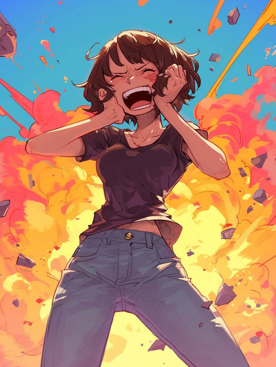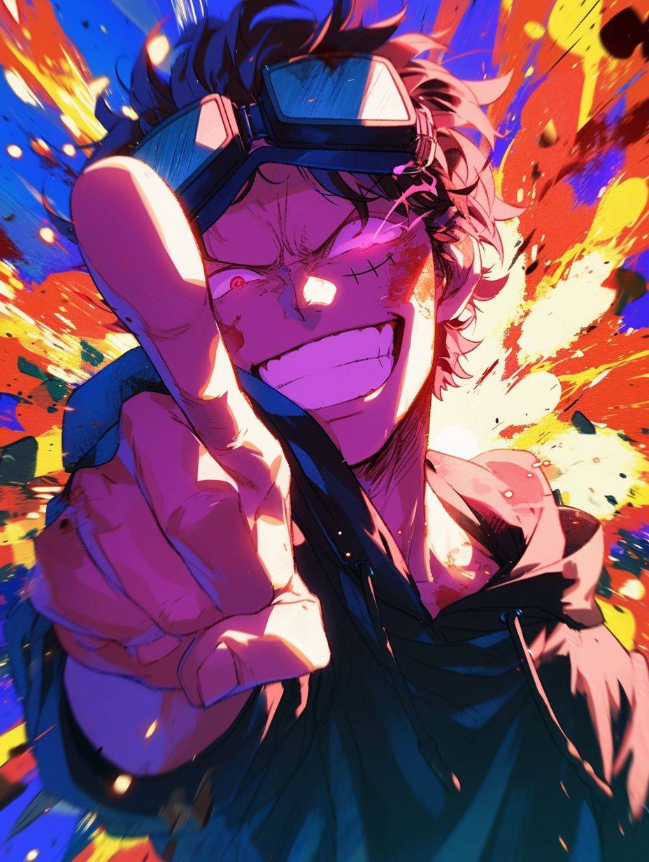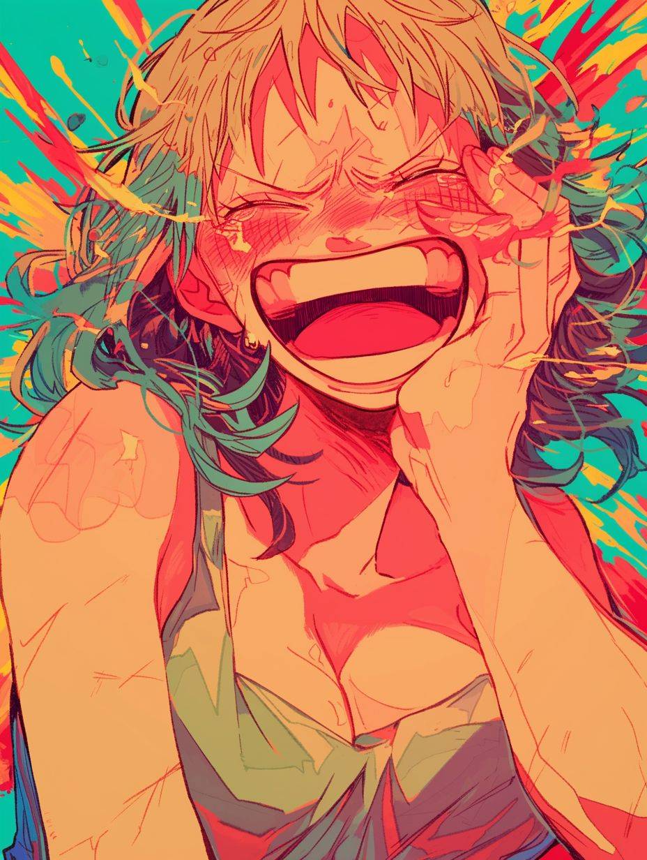 One Piece presented in Scott Pilgrim style with a laughing expression and explosion background.